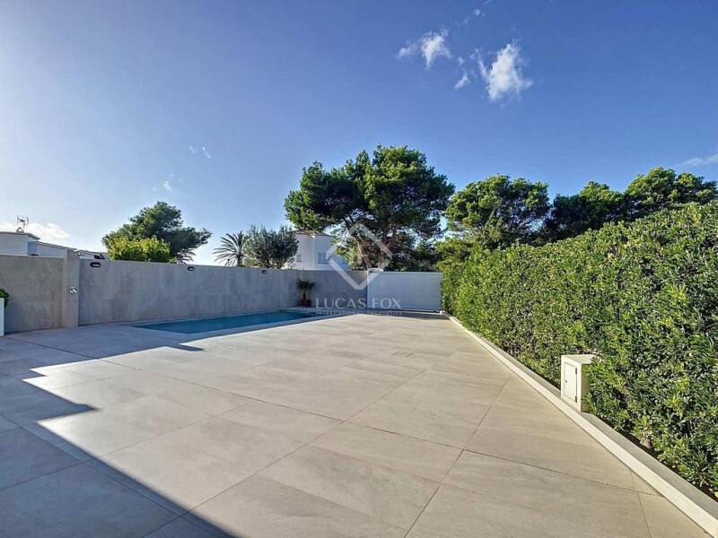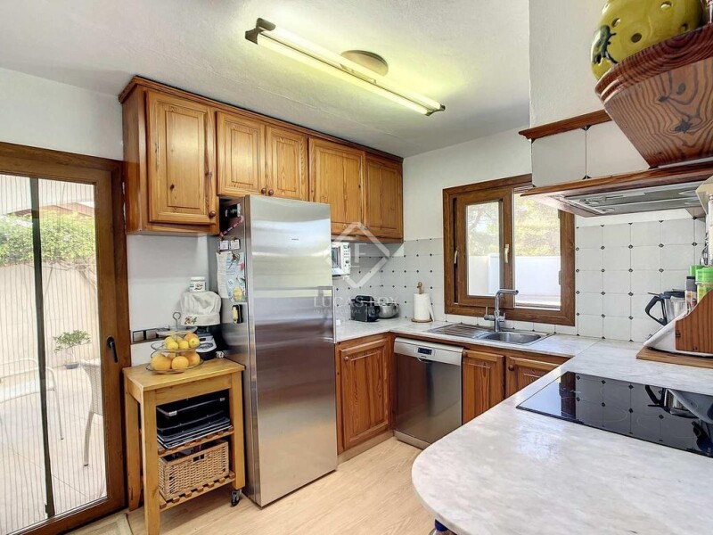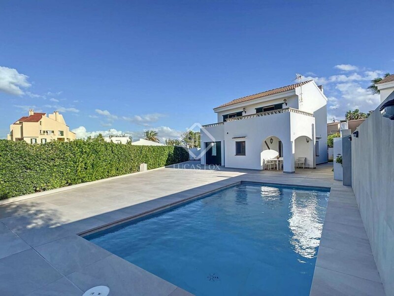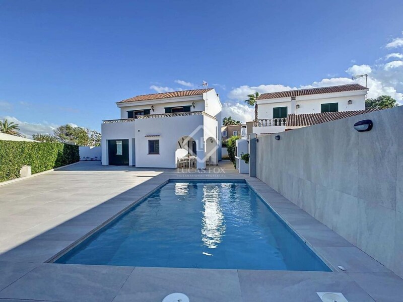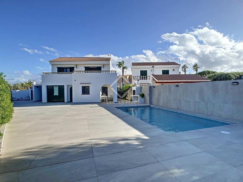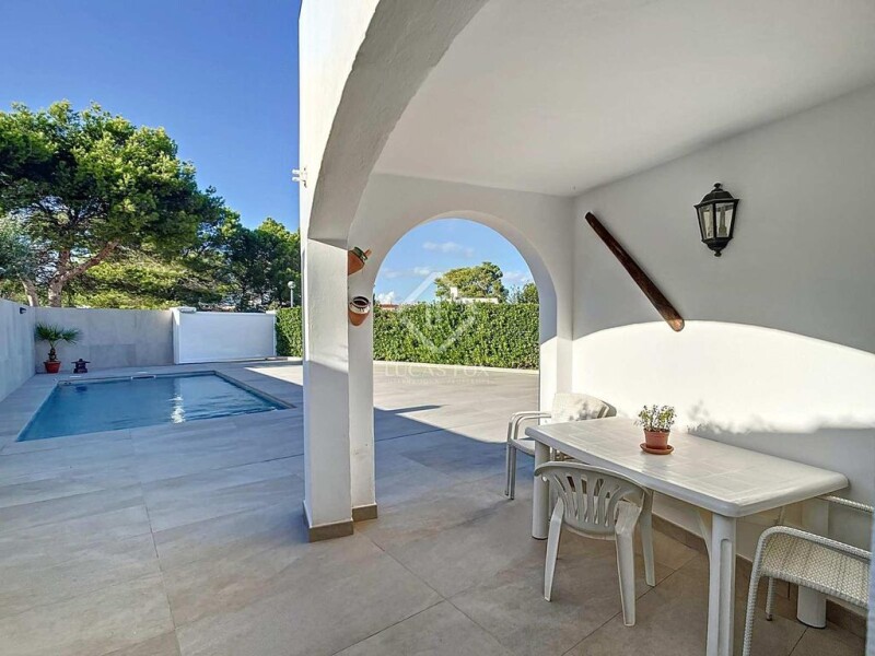 Lucas Fox presents this 140 m² villa built on a 415 m² plot in the Cala Blanca development in the municipality of Ciutadella de Menorca. The property is distributed over two floors. The ground floor welcomes us with a small entrance hall. Next, there is a separate kitchen with access to the covered porch with barbecue area and pool surrounded by a paved terrace-solarium. On this same floor, we find the living-dining room with fireplace and also with access to the porch, as well as a full bathroom and access to the garage currently used as a laundry and storage room laundry area . Through a comfortable staircase we reach the first floor where we have a small hall, a full bathroom and three double bedrooms, two of them with built-in wardrobes and access to a wonderful terrace with partial views of the sea. The house has double exterior and interior insulation, PVC exterior carpentry with double glazing in imitation wood, oil central heating with radiators in all rooms and with the possibility of changing the boiler for aerothermics, mosquito nets and a split cold air conditioning -heat on each floor. In the exterior and front area of the house, we find the fully paved pool and solarium area, barbecue, a porch used as a garage, two storage rooms used as a boiler room, while there is a vegetable garden area in the back. Without a doubt, an ideal property to live in all year round or spend time with family and/or friends. Contact us for more information or to arrange a visit.
