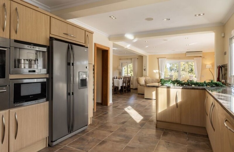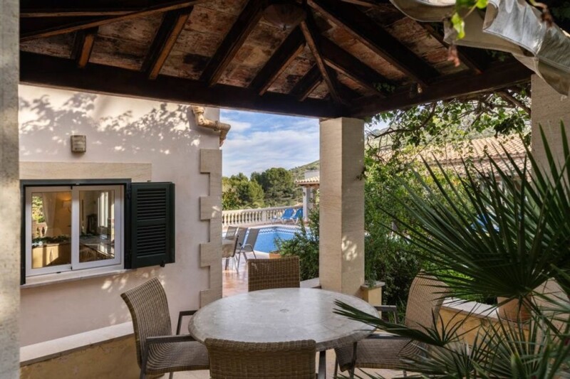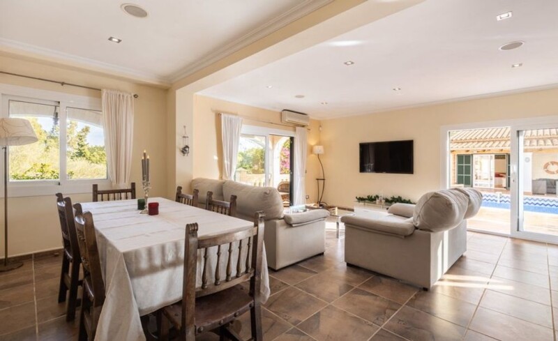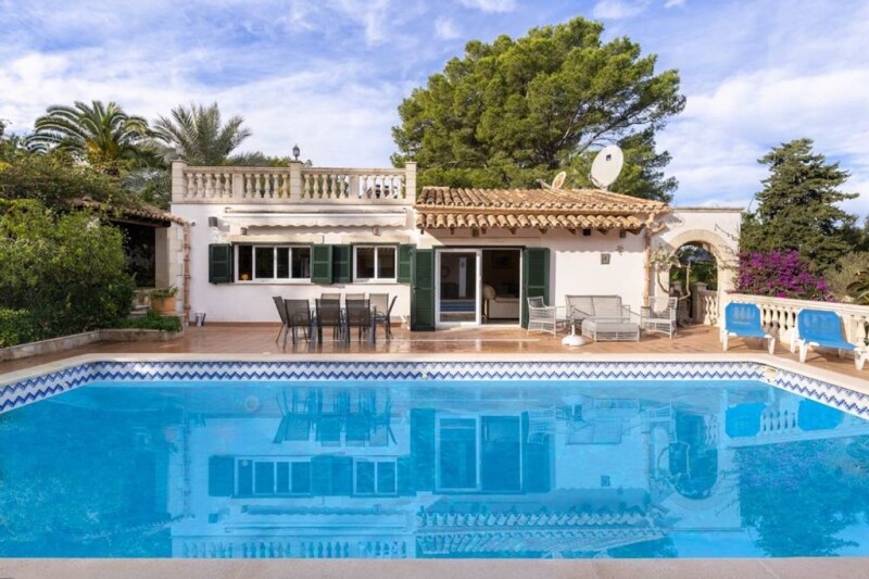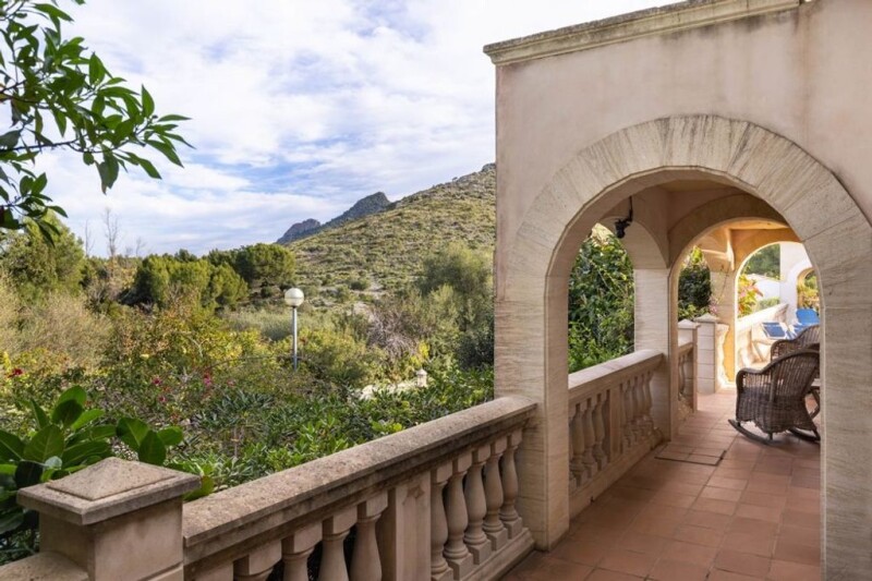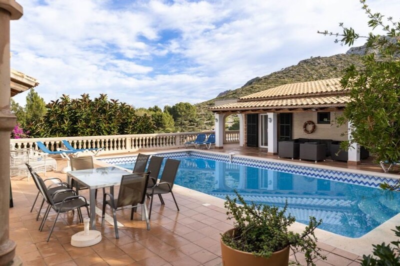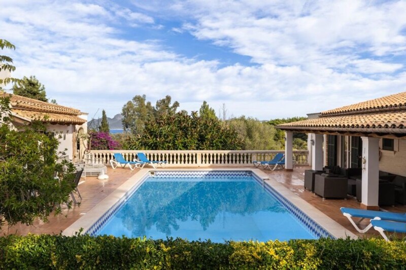 Mediterranean villa with guest house and sea view in Alcudia The total living space is approx. 344 m² and is located on a plot of approx. 770 m². The property is located in popular Alcudia and only approx. 5 minutes from the harbor. The villa consists of a bright living room with an open kitchen and a balcony that surrounds the entire property, 2 bedrooms and 2 bathrooms. The separate guest house, separated by the heated pool and the large sun terrace, has a total of 3 bedrooms and 3 bathrooms. All rooms in the villa are furnished. There is also a small breakfast terrace to the side and a roof terrace with unobstructed views of the sea. The villa was renovated in 2018 and the rooms are equipped with air conditioning for hot and cold air. A private lockable garage and numerous guest parking spaces in front of the entrance are also available. Garage, outdoor parking spaces, heated pool, air conditioning, furniture.