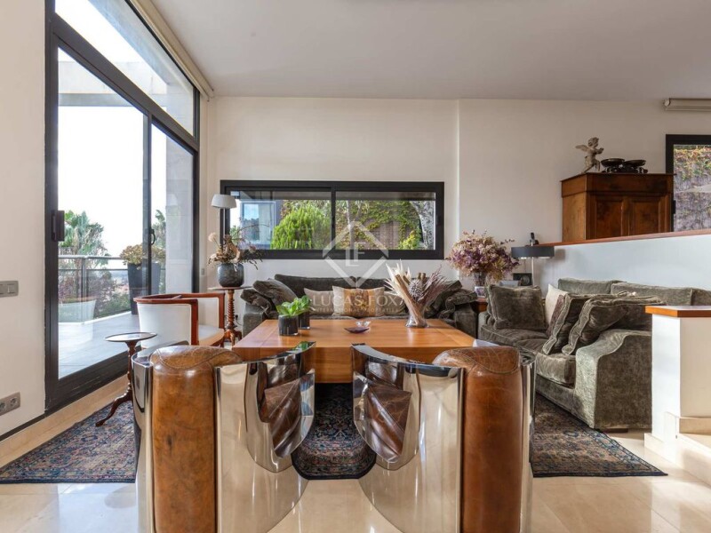 Modern and elegant house of approx. 451m2 built (cadastre) in 1991 on a plot of 801m2, with comprehensive renovation in 2007, including the façade. This exceptional house is made up of four floors with sea views linked by an lift and stairs, taking advantage of the different terraces of the garden plot. It has a very functional and modern design, as well as being very cozy and full of personality. The luminosity and tranquility of its rooms, all exterior, stands out. In addition, the house offers exclusive amenities such as a 653.65m² perimeter garden with a 42m2 pool, two porches ideal for a chill-out, 5 bedrooms, four bathrooms and a guest toilet. It has a garage with capacity for two cars and motorcycles, as well as exterior space for another two. The house is accessed through the garden at street level. The house is distributed over four floors with a clear separation between day area . On the ground floor, entrance hall with staircase to the spacious living room with two rooms with fireplace and double-height space, large balconies open the space to the porch area and exterior terrace of 19.62m2 with fantastic views of the sea, next to the fireplace area. the adjacent study library room. The formal dining room with access to the side garden is located four steps above the level of the living room, which allows the uses of the space to be differentiated from the day area without visually dividing them and keeping it open-plan. Two entrances connect the dining room with the kitchen, next to one of them the lift. The kitchen with a central island and office area is equipped with high-end appliances such as Miele or Neff, it has a gas and induction stove, oven, microwave, cocivap and American refrigerator. The kitchen has access to both sides of the plot , in one of them is the exterior access staircase and the room with the softener, in the other a large storage room wardrobe and another for cleaning, as well as the terrace with a dining table. garden level dining room and sea views. Here there is a access from the street directly to the garden . A guest toilet completes this floor . The first floor , at street level, has a central hall with views of the double living room space, which gives access to two double bedrooms with built-in wardrobes and sea views, which share a full bathroom with shower, an en-suite bedroom with built-in wardrobes, access to a 9.54m2 terrace with sea views and a full bathroom with bathtub and bidet. And to the garage for two cars and motorcycles with an exterior area for another two. The second floor has a large room used as a gym in its circular façade area and as an study in the area where the bedroom suite was located with access to a 61.85m2 perimeter terrace with sea views. The built-in wardrobe and the bathroom with shower. The semi-basement floor has a hallway with closets and the lift, a full bathroom with shower, a double bedroom with a built-in wardrobe and wine cellar- storage room under the stairs and access to the porch with sea views. The floor is completed by a living room with a games area and access to the 36.96m2 porch. In the porch area there is the laundry room and the lift machine room. From the porch and garden a staircase goes down to the large garden with the pool surrounded by wood and natural limestone. The house has heating by radiators and a condensing boiler with accumulator with a thermostat on the 1st floor . Aluminum windows with double glazed glass. Gradhemetic motorized blinds with adjustable slats on floor 1 and 2. Motorized screens on the ground floor. Ducted air conditioning on the 1st floor bedroom area and through Split in the suite. Security system with alarm. Descaler and osmosis in the kitchen. Automatic watering. Wooden floors in the night area and marble floors in the day area, stoneware in bathrooms and outdoor areas . The Ciudad Diagonal area has private security. An extraordinary house, with a garden, swimming pool and garage in one of the best neighborhoods of Esplugues de Llobregat. Contact us to visit this luxury home.