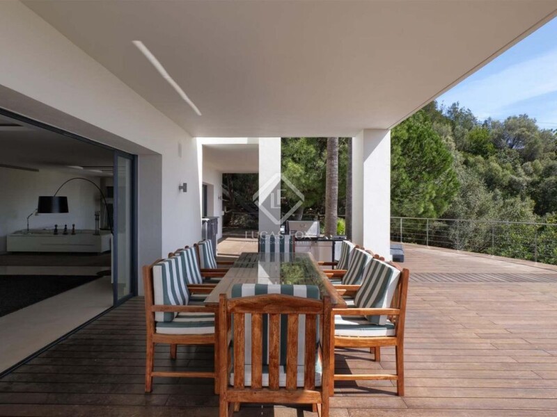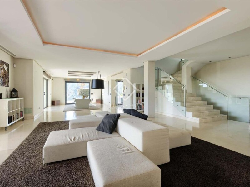 With ample space it is a 5-bedroom, 6-bathroom villa. This wonderful modern villa offers a wholly spacious living and dining areas with a gas fireplace and access to large terraces of high-quality pressed bamboo and offers panoramic views. The open-plan fully-fitted kitchen is complete with Gaggenau appliances, the guest toilet and one guest bedroom en suite. The upper floor consists of hallway entrance, master bedroom with dressing en suite and extra sitting salon currently used as an office as well as one guest bedroom with en-suite bathroom. The lower floor offers two guest bedrooms each with en suite as well as a cinema room for 15 people, a wine cellar and storage rooms. There is additional extra space which could be used to do a fitness room, gym, spa or staff quarters. The drive area offers outside parking with the possibility to add a carport for up to three cars. The large private pool is built with chill out areas to get the most from the stunning views.