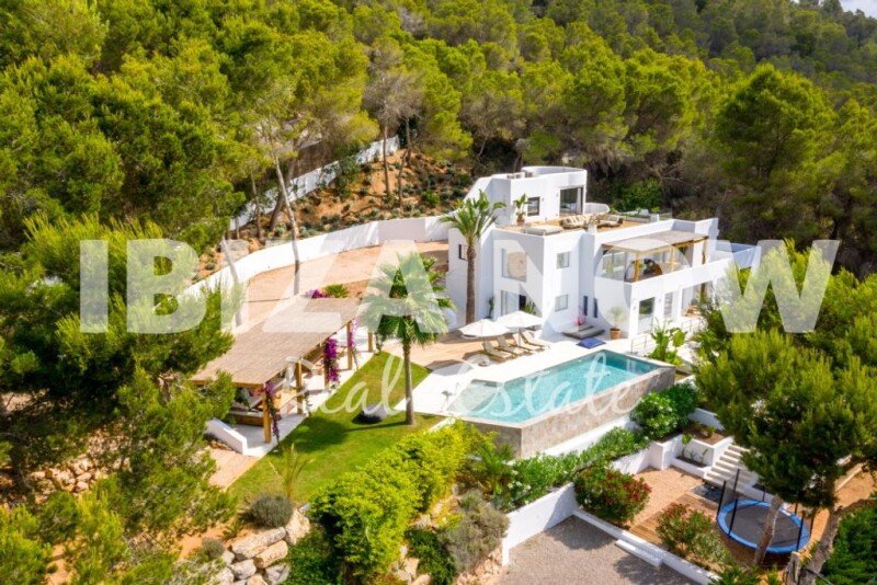 Beautiful 6 bedroom villa for sale in Es Cubells, Ibiza, Spain. This beautiful modern villa is located in a quiet area and offers stunning sea and mountain views. It stands on a plot of 2600 m2 and the house is 400m2 and built on 3 floors. On the entrance level you enter a large living/dining area with open kitchen overlooking the garden and pool area and Formentera. There is also a smaller bedroom with private bathroom and a double bedroom, also with private bathroom. On the second floor is the master bedroom with private bathroom and walk-in closet. Here you have a huge terrace with outdoor shower and again fantastic sea and mountain views. The lowest floor of the house offers 1 large bedroom with en-suite bathroom, another large bedroom and a smaller bedroom that shares a bathroom. There is also a storage/utility room. All rooms have direct access to the garden area with infinity pool and a large outdoor kitchen and covered chill-out area with a large dining table. The property has 2 entrances. A truly wonderful family home in a perfect location.