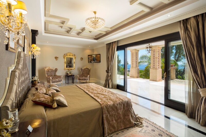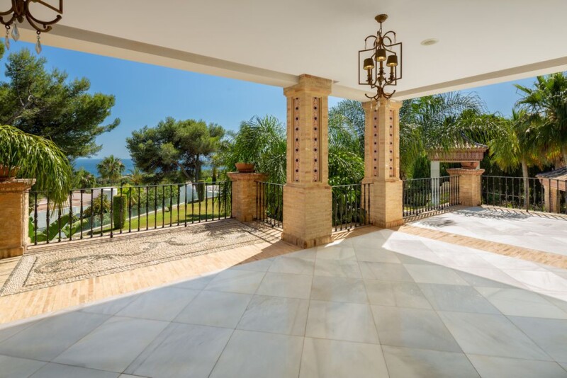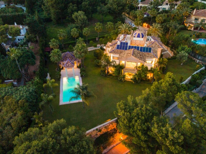 This magnificent mansion is located in a small and prestigious gated community consisting of only 7 villas. The location is unique as is it so close to everything, yet still has the atmosphere of your very own paradise - together with its panoramic views.There is 24 hour security which means it is only accessible for residences and guests, making it very private. An impressive 18th century gate gives access to the courtyard, paved with stones from an old Roman road. You enter the house through a large spectacular wooden door and arrive in the entrance hall which has a view to the first floor balcony. A roof window allows natural light to fill the room. A beautiful staircase chiseled from one block of marble leads to both the lower and upper floor. Naturally a lift is also installed as an alternative to the staircase. On the upper floor there are 3 large bedrooms and a large salon which could be converted into a bedroom. All bedroom suites have bathrooms and a large walk-in closet is accessible from the master bedroom. Each room also has a private balcony from where the panoramic views can be enjoyed. The atrium in the centre of the house also brings light and fresh air to the property. On the main floor you’ll find a separate dining salon, a great sized living room, additional office and spacious kitchen. The atrium with its charming water display is accessed on this floor and the living room leads out to the lush garden with plenty of privacy and again beautiful panoramic views. Adjacent to the long pool there is a separate pool house with dining space, bathroom and dressing room. The lower level offers a cinema, a bodega and a games/pool room. Also a separate guest/staff apartment with its own entrance is at this level. The house has been built with the most exquisite materials and solutions. A pellet burner provides hot water in combination with the solar power which helps to keeps the energy costs at bay.