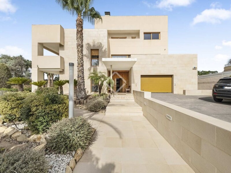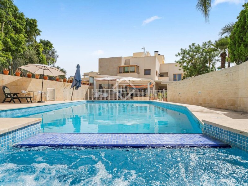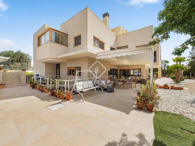 This villa boasts the largest residential plot with 2,029m² in the Golf area, offering panoramic views over the emblematic Alicante Golf resort. The villa boasts an enormous 856 m² of built surface area and is uniquely positioned on a hill, providing astonishing panoramic views over the golf area, up to the Mediterranean ocean. The house is divided into a lower ground floor, ground floor, first floor, second floor, and roof terrace, and is equipped with air conditioning and a lift. The lower ground floor is a haven for entertainment and relaxation, featuring a home gym with a bathroom, bodega, sauna, two additional (storage) rooms, and a bar and home cinema. The ground floor is an indoor extension of the terrace. We are greeted by a beautiful hallway with a high ceiling. It includes a bright living room, fully equipped kitchen, utility room, complete bedroom, a bathroom, and a private garage. The first floor is designed as a private area, it houses the main bedroom with a main bathroom that includes a whirlpool, a walk-in wardrobe, and a private terrace. Furthermore, it has 4 more bedrooms, of which most enjoy their private terrace and bathroom. On the second floor, there is an office with access to the roof terrace. The large terrace on this floor offers access to the rooftop, where you can enjoy the astonishing panoramic views. The plot features an expansive garden with a porch, a pool, irrigation system, direct access to the golf course, jacuzzi, playground and a large terrace. The Golf area is one of the most exclusive areas of Alicante, desired for its central location. It is only a 5-minute drive to San Juan Beach and a 15-minute drive to the city centre of Alicante. This unique area in Alicante is known for its green surroundings, thanks to the Golf resort. It offers convenience, is well-connected to facilities, and is a quiet, exclusive area. This villa is perfect for those who seek luxurious living in a serene and exclusive environment, with all the conveniences and amenities close by. Contact us to arrange a viewing.