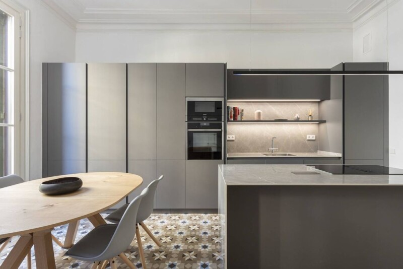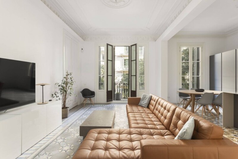 Impressive refurbished modernist apartment in a regal building in the best area of the Eixample derecho. Exquisite apartment in one of the best areas of the Eixample, just 3 blocks from Plaza Catalunya and Paseo Sant Joan. Its central location allows you to enjoy in the surroundings of stores, services, shopping centers, boutiques of Paseo de Gracia, historical and cultural attractions, leisure offers and public transport options. The apartment transmits all the beauty of the modernist character, with the high ceilings characteristic of a main floor with moldings and Catalan vault, hydraulic floors with different mosaics and wooden carpentry. It is located on the second floor of a royal estate with elevator, in which there are only two floors in each of its 5 floors. The apartment has 109 m2 built interior and an elongated balcony of 6 m2. The day area is a spacious living-dining room with open kitchen and central island. It is oriented towards the street and has 2 large exits to the balcony through which enters a lot of natural light. The kitchen is equipped with first class appliances. The apartment has 3 bedrooms. The master bedroom is en suite with bathroom (with shower) and interior, very quiet. Another bedroom is a double with access to the balcony and, next to it, there is a single room with office area. In addition, there is a separate bathroom with bathtub. The apartment is equipped with ducted hot/cold air conditioning and parquet floors in 2 bedrooms.