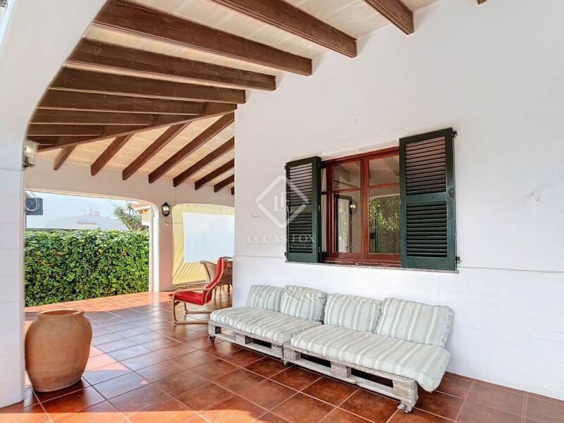 Lucas Fox presents this wonderful 206 m² villa on a 515 m² plot with a tourist license in the Cala'n Bosch development in Ciudadela (Menorca). The property is distributed on one floor, and at the entrance we are greeted by a large porch with exposed wooden beams that gives access to the dining room living room with a semi-open kitchen and access to the patio. A double bedroom completes this area. From here we enter a corridor where we find a bathroom and two double bedrooms, one of them with access to the patio. In this patio we have a utility room and a bathroom with a shower. Exterior there is a terrace, a utility room, a 40 m² swimming pool, a garden, a 48 m² garage and a barbecue area that is currently used as a storage room. An exterior staircase in the patio leads to the solarium terrace, where there is the possibility of building another floor offering spectacular sea views. The villa is located on a very quiet street just a few steps from the beach, with access to a bathing area and several other beaches on the south coast of Menorca. In short, this is an investment opportunity as a first or second residence. On the other hand, it could also be rented out seasonally thanks to its tourist license. Please do not hesitate to contact us for more information and to arrange a viewing.