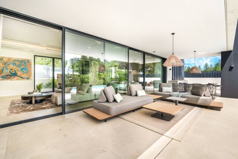 Luxury villa for sale in the heart of the Golden Mile, Marbella Introducing a pristine 5-bedroom luxury villa situated in the heart of Golden Mile, nestled in the coveted and alluring Rocio de Nagueles area of Marbella. This enchanting residence offers proximity to the town center, picturesque promenade, and a private British International School, ensuring convenience and accessibility for residents. Perched on an elevated position facing south, the villa enjoys sweeping views of the sea and mountains, basking in sunlight throughout the day. The main level features a generous living room divided into sitting and dining areas, an open-plan and exquisitely equipped kitchen, a bedroom with an en-suite bathroom, and a guest toilet. The outdoor space boasts a refreshing swimming pool, a barbecue area, and a kitchen, perfect for outdoor entertaining and relaxation. The upper level houses the master bedroom with an en-suite bathroom and direct access to a terrace offering captivating sea views. Additionally, there are two bedrooms sharing a bathroom, each opening up to the terrace for a seamless indoor-outdoor flow. The basement area is a haven of amenities, including a Finnish sauna, gym, spacious bedroom, storage room, cinema room, guest toilet, TV zone, and a uniquely designed bar. Furnished with renowned Italian brands like "Bonaldo," "Ditre," and "Talenti," this villa exudes sophistication and style. Boasting an array of features such as an alarm system, underfloor heating, air conditioning, and wooden floors in the bedrooms, this eco-friendly home spans three levels and covers 813 m² of meticulously crafted living space. Large windows bathe every room in natural light, creating a seamless connection between the interiors and the lush surroundings. The 1,050 m² plot exudes a special Mediterranean ambiance that characterizes Marbella, accented by majestic pine trees that contribute to the enchanting atmosphere of the property.