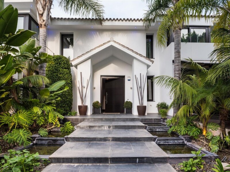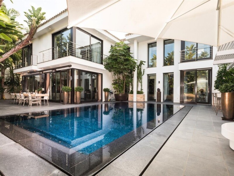 This contemporary style villa, located in the exclusive area of Los Monteros beach, offers everything a client could wish for. A luxury residence, easy to maintain and renovated with the best materials and top quality brands. Now with furniture included. Just 5 minutes drive from the center of Marbella. About 300 meters from what is considered the best beach in Marbella, this contemporary style villa, completely renovated with the best materials and first-class qualities, is designed down to the last detail to convert this oasis of privacy, surrounded by palm trees and tropical vegetation. , in a luxury residence for the most demanding taste. A fluid integration between the interior and exterior spaces, the large windows and the garden design with the swimming pool and barbecue and leisure area as the main protagonist, contributes to creating a unique environment where serenity and harmony reign. A villa that has it all, with more than 230 meters of terraces, it has 6 spacious and bright bedrooms with their en-suite bathrooms, a high-end kitchen open to the spacious living room with a fireplace, an impressive cinema room, a massage, sauna and a generous service and laundry area. The quality and exquisite details of the property are completed with an installation of integrated, electric shutters and an excellent security circuit.