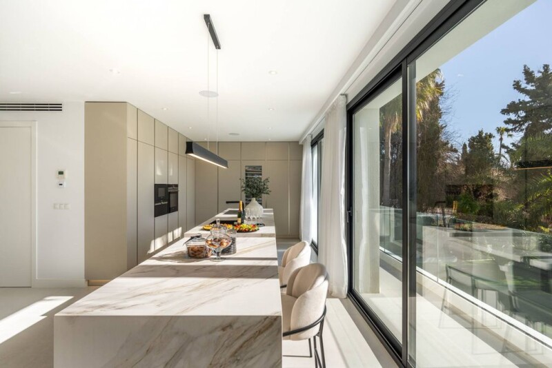 Stunning beachside Villa – a blend of modern comfort & timeless elegance in Marbesa, Marbella East Nestled in the prestigious Marbesa neighborhood, this four-bedroom, four-bathroom villa is a masterpiece of contemporary Andalusian design, offering an elevated lifestyle just steps from the beach. Spanning 405 m² on an 800 m² plot, this south-east facing residence is designed for year-round comfort, combining cutting-edge technology with elegant finishes to create an exceptional living experience in Marbella East. Recently completely rebuilt, the villa features advanced thermal insulation and high-tech AAC concrete blocks, ensuring soundproofing and energy efficiency for a peaceful, climate-controlled environment. The multi-zone radiant floor heating enhances comfort throughout the home, while whitewashed walls, elegant arches, and refined finishes capture the charm of classic Andalusian architecture with a modern twist. The open-plan living and dining area seamlessly connects to the outdoor spaces, where a heated saltwater swimming pool, lush private garden, and multi-zone indoor & outdoor sound system set the stage for both relaxation and entertainment. The villa comes fully furnished, with every detail carefully selected to complement its sophisticated aesthetic—offering a true turnkey experience. Situated in one of Marbella’s most desirable beachside communities, Villa Vista offers the perfect balance of tranquility and convenience. With golden sandy beaches, charming chiringuitos, and coastal walking paths just moments away, every day feels like a holiday. Just 30 minutes from Málaga Airport, this home is an ideal retreat or investment in a high-demand location.
