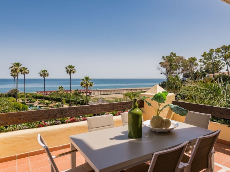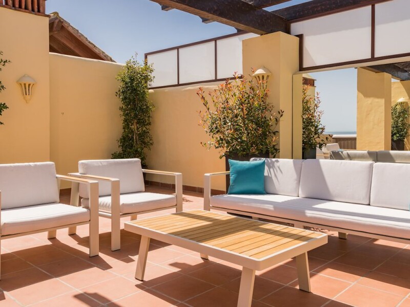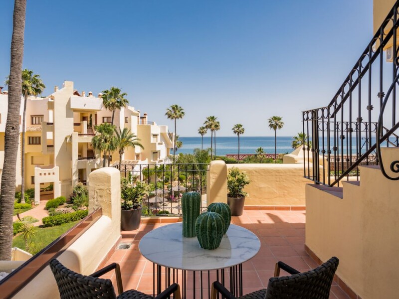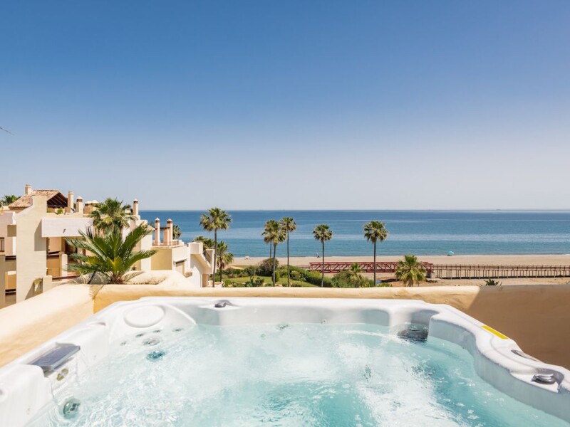 Fully renovated to the highest standards, 4-bedroom duplex penthouse. Located in a frontline beach complex with great sea views and south facing. Walking distance to several beach restaurants and bars and towards Estepona town center. Main floor: Entrance hallway, living-dining area with open plan fully fitted kitchen, one bedroom en suite and one bedroom with separate bathroom. Direct access from the living area to a terrace. First floor: Master bedroom en suite and one other guest bedroom en suite both with terrace. Upper floor solarium. Private chill-out area with BBQ, sauna and jacuzzi. Beautiful location, top quality property!.