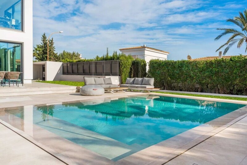 Luxuary villa located in Santa Ponsa with sea views Nestled in one of the most exclusive locations in Santa Ponsa, this extraordinary villa captivates with breathtaking panoramic sea views and a high end renovation that leaves nothing to be desired. A masterpiece of modern design, German precision, and the finest materials, this luxurious residence offers an unparalleled living experience. The grand, gallery style entrance leads into an open plan living area, bathed in natural light through floor-to-ceiling windows. The dynamic split level architecture adds an element of sophistication, seamlessly blending contemporary elegance with functionality. Adjacent to the living space, the state of the art Nolte kitchen is equipped with premium Siemens and Miele appliances, including an integrated wine fridge. For added convenience, a separate preparation and utility kitchen ensures effortless entertaining. On the main level, a self contained guest apartment with an en-suite bathroom offers privacy and direct access to the expansive south-facing terrace. Here, uninterrupted views of the Mediterranean create the perfect setting for sun-soaked days and serene evenings. Thoughtfully designed for ease of living, the villa also features an integrated garage for seamless access. A sleek staircase leads to the upper floor, where an open gallery space serves as an ideal office or lounge. The opulent master suite boasts an en-suite bathroom, a walk in dressing area, and a private south-facing balcony, allowing you to wake up to mesmerising sea views. Two additional bedrooms and a stylish bathroom complete this level, providing ample space for family and guests. This villa exemplifies the pinnacle of luxury living in Mallorca. A meticulously designed layout, exquisite materials, and first class amenities make this property a standout. Premium features include an air-source heat pump, underfloor heating, and a state of the art climate control system for year round comfort. Custom crafted wood and natural stone elements adorn every bathroom, while the newly designed saltwater pool has been completely refurbished. The exterior landscaping is equally impressive, featuring majestic olive trees and a fully automated irrigation system.