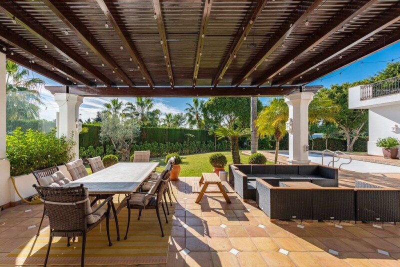 Luxurious villa for sale on the Golden Mile, Marbella Nestled in the esteemed neighborhood of Sierra Blanca within Marbella Golden Mile, this charming residence stands out in an area renowned for its opulent estates, often drawing comparisons to Beverly Hills, reflecting its appeal to Marbella's most discerning residents. Positioned approximately 2.5 kilometers from the beach, the locale offers a serene living environment suitable for individuals of all ages. Upon entry, you are greeted by a grand entrance hall featuring lofty ceilings adorned with wooden beams. The inviting living room seamlessly transitions into a cozy TV area, ideal for unwinding or entertaining guests. Adjacent to this space lies a separate dining room, perfect for hosting gatherings with loved ones. Discovering the ground floor further reveals two beautifully appointed bedrooms, each complete with its own luxurious en-suite bathroom. The functionality of this level is enhanced by a well-appointed kitchen catering to culinary enthusiasts, alongside a convenient laundry room that seamlessly combines practicality with elegance. Ascending to the upper floor, you are introduced to a generously proportioned master bedroom suite, accompanied by an adjoining office space that can easily be transformed into a lounge area, providing personalized comfort and convenience. What sets this property apart is its adaptability and versatility. Beyond the main residence, two additional en-suite bedrooms offer ideal guest or staff accommodations. The clever design enables these external quarters to adjoin the main house effortlessly, sharing a wall with the master bedroom. This unique feature allows you the flexibility to either integrate these spaces into the primary living area or maintain them as discrete, self-sufficient units, catering to a variety of lifestyle preferences.