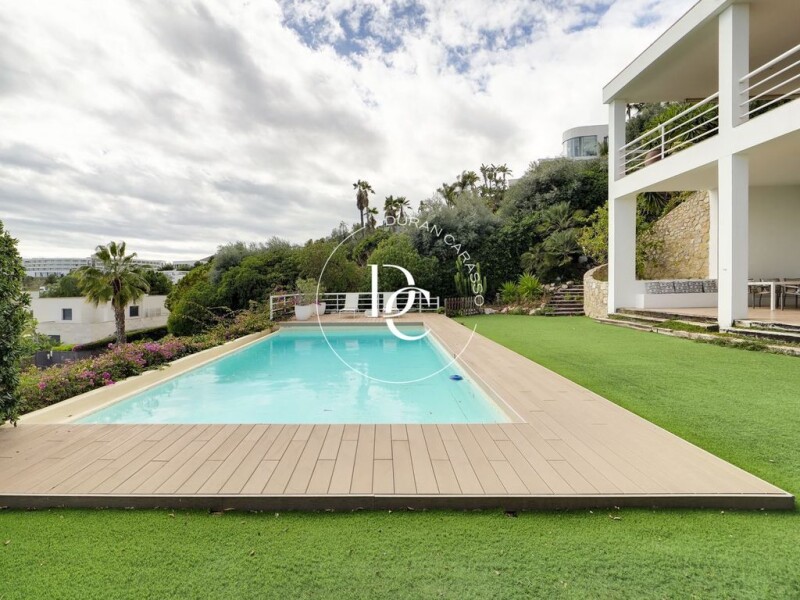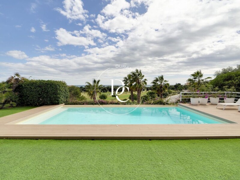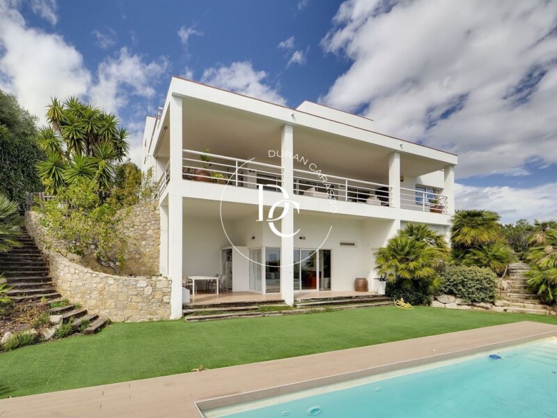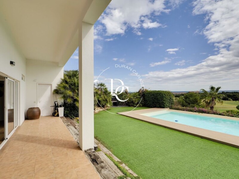 In the exclusive Can Girona development, we find this magnificent house with a privileged location. Its south-facing orientation and position give it one of the best views of the entire development, overlooking the sea and the golf course, completely unobstructed. This house, divided into three floors, has an exquisite layout. On the first floor, we find a large, light-filled entrance hall, a spacious living room with large windows, a dining room, an office kitchen, a laundry area, and a service room. In the night zone, there are two bedrooms: the master suite with a sitting area and a bathroom with access to a private terrace, plus another double bedroom, also en-suite. Additionally, there is a large porch with an outdoor dining area and a chillout zone. Going up one floor, we find three spacious en-suite bedrooms and two large terraces. All bedrooms have built-in wardrobes, are exterior-facing, and offer sea views. In the garden area, there is a large pool, barbecue area, a porch, a lounge, and an en-suite room. Don't hesitate to visit it. Live where you deserve to live!.