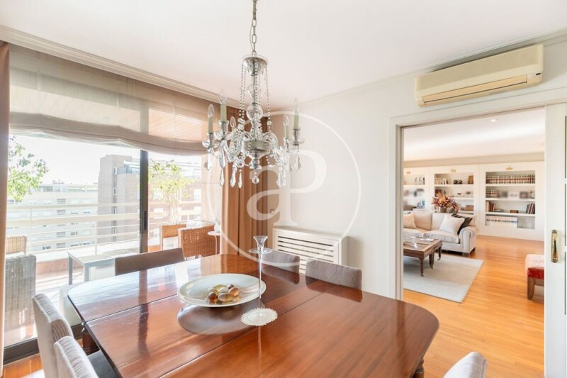 Located in one of Barcelona’s most exclusive residential areas, in the Pedralbes neighborhood, aProperties presents this magnificent, fully exterior penthouse of 160 m² with a splendid attic of 141 m², pitched ceilings with a maximum height of 4.30 m², and a 21 m² terrace. Situated on the tenth floor, the day area features a spacious living room with a fireplace and a dining area, divided into two spaces separated by a sliding door, both with direct access to a pleasant terrace with views of the sea and city, thanks to its great height. The fully equipped kitchen with an American-style central island is perfect for family or friend gatherings and opens to the utility area. Here, two independent boilers service the radiator heating system for each floor of the property. The night area on this first floor includes two double bedrooms that share a full bathroom and a suite with its own bathroom. All rooms are exterior, facing Tibidabo, with built-in wardrobes, storage spaces, split air conditioning, and radiator heating. We access the attic on the upper floor via an elegant and practical wooden interior staircase, where we find two areas: a social space with a large TV room with a minibar, storage space, study area, game room, and a grand double suite with built-in wardrobes, dressing room, and full bathroom with jacuzzi and shower. This floor has air conditioning with a heat pump, in addition to radiator heating. The four-sided building offers a community area with a large garden and a recently renovated pool, as well as a children’s playground with swings, a meeting room for various community or private events, and a game room. It also has concierge service for each staircase during the week and a 24/7 security booth. The apartment includes two parking spaces and a storage room in the same building, accessible by the two elevators available in the residence. Don’t miss the opportunity to visit this property and make it your new home!.