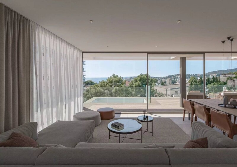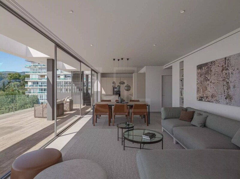 Luxuary Penhouse apartment located in Palma De Mallorca with sea views This modern penthouse is part of the new Mar Adalt development, located just a short distance from the city center. The project includes 23 luxurious apartments, blending high architectural standards, sustainable construction, and resource efficient energy solutions. The residences boast breathtaking views of the Mediterranean Sea and Palma’s lush hills These bright, airy homes feature gardens, terraces, loggias, or additional rooftop terraces, ensuring the highest levels of quality, comfort, and privacy. The central area of the development includes an expansive pool area surrounded by beautifully landscaped gardens, providing an ideal space for relaxation. Private underground parking spaces and storage rooms complement the high-end offerings. Apartments on the upper floors include generous living-dining areas with integrated kitchens, west-facing lounges that exude comfort and charm, and east-facing bedrooms with adjacent bathrooms offering views over the city’s green hills. The interiors feature Zarci-grey 90x90 hammered, aged, and water-repellent porcelain tiles, as well as classic natural oak parquet flooring. The bathrooms are fitted with water-resistant Zarci-grey shower trays, and outdoor surfaces are finished with the same high-quality materials. The external stairs and the metal staircase add to the overall elegance. The smooth, matte-white sliding doors with wooden panels and the custom designed wardrobes feature sleek, white lacquered doors, mechanical center handles, and stainless steel hanging rods. The bathrooms feature custom vanities with integrated sinks and solid surface countertops, with finishes varying by floor. Each residence is equipped with subtle, elegant lighting by BPM Lighting, adjustable spotlights by Martorell and Bliek, as well as Minialba long-field lights to highlight the most striking areas. LED lighting is also integrated into the soap dishes and mirrors. Kitchens come fully equipped with Espacio Home’s Long Line Star laminate furniture in Kashmiri color, featuring integrated handles and 10cm high stainless steel baseboards. Appliances from Balay, a Spanish-German brand known for their innovation, energy efficiency, and commitment to sustainability, are included. Blanco taps and hobs from Bora, recognized for their superior quality and design, complete the kitchen, while the countertops are finished in Zarci grey, water-resistant with a protective 5/6 cm high baseboard. This penthouse is an exceptional blend of modern luxury, eco-conscious design, and breathtaking views, offering the best of urban living in Palma.