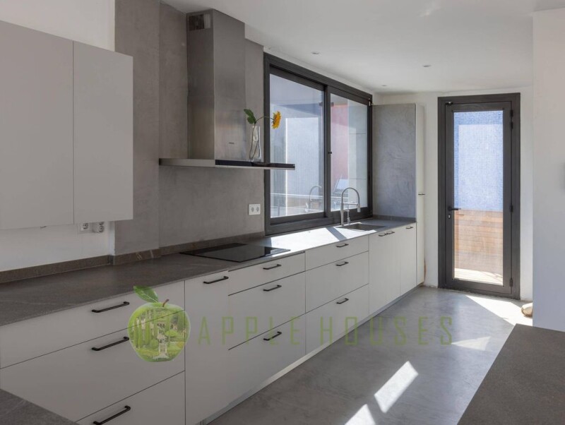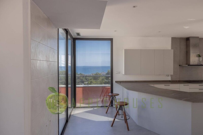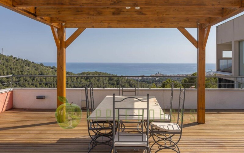 On the first floor, there is a studio with an independent entrance, a reading/office area, and a spacious en-suite bedroom that includes a private bathroom and direct access to a terrace with sea views. From here, the elevator or stairs lead to the bedroom floor. This floor houses three bedrooms: a large en-suite bedroom with a walk-in closet and access to a private terrace, a double bedroom with access to two terraces, and a third bedroom that can be used as a reading room. There is also a large bathroom with a bathtub. The entire house enjoys natural light, making it very bright and welcoming. The next level offers the daytime area, an open space featuring an open kitchen integrated with a large living-dining room, both spaces with direct access to a terrace. Additionally, there is a guest bathroom on this floor. From here, you can access a secondary terrace with wooden floors that leads to the top level where the infinity pool and an extensive terrace with wooden flooring are located, perfect for enjoying the Mediterranean climate. All the terraces of the villa offer stunning views of the sea and the town of Sitges. The property boasts high ceilings and construction details with natural stone on some walls, adding a touch of elegance and distinction. It is equipped with solar panels and a home automation system for a more efficient and comfortable living.