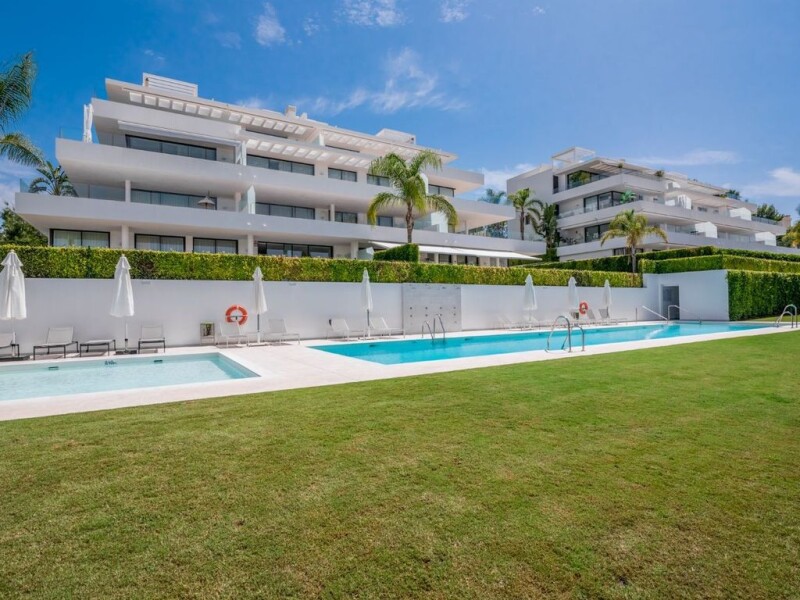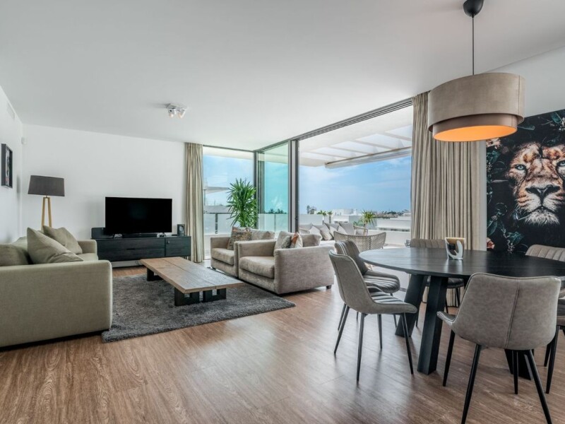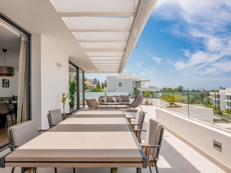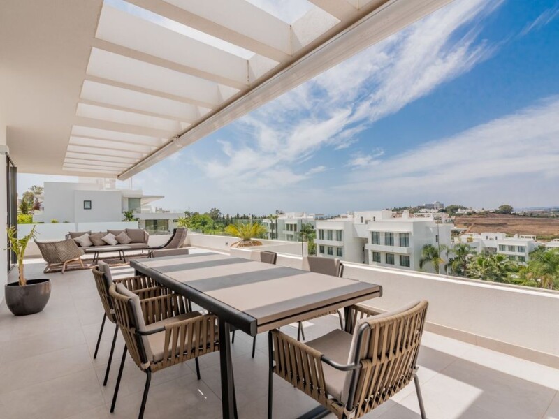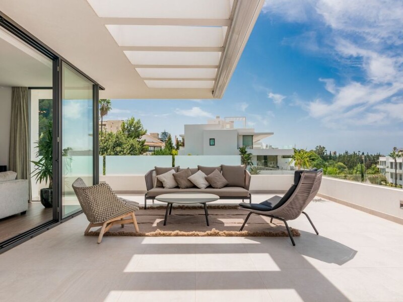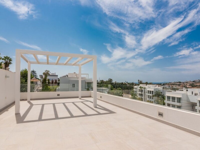 Modern duplex penthouse located in a prestigious urbanisation of Costa del Sol, offering cutting edge design, high quality construction and finishes, as well as a host of luxury amenities for outdoor living at it’s finest. The property comprises, on the entrance level, 2 guest bedrooms sharing one bathroom, the master suite with en-suite bathroom, a spacious open plan living and dining room leading to the fully equipped modern kitchen. All have direct access to the large terrace through floor to ceiling windows, providing an abundance of natural light throughout the day. Upstairs, the property offers a spacious rooftop terrace with partial sea views. The elevated position in the community allows for optimal views and privacy. Furniture optional.