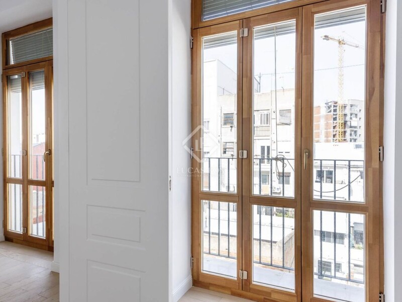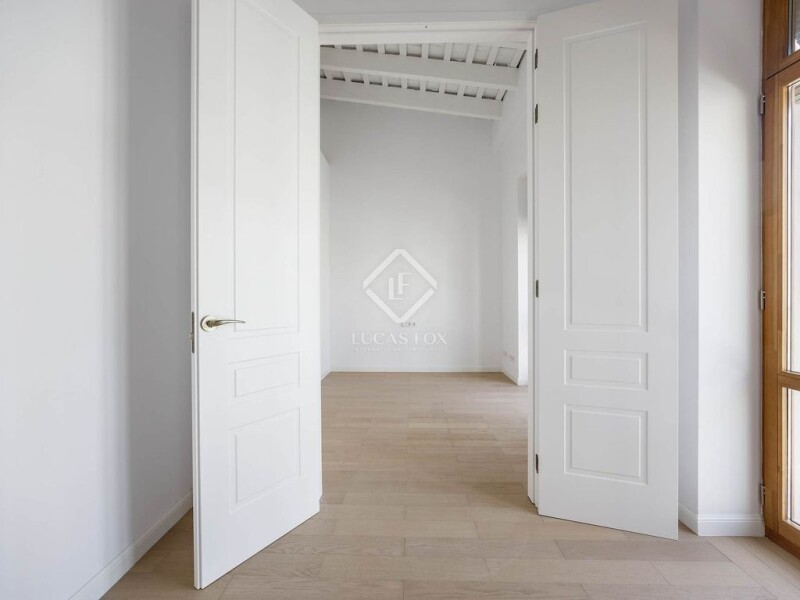 Fantastic property in a building from the early 20th century that has been completely renovated, maintaining the structure and style of the period. The solid brick walls, high ceilings with wooden beams and brick vaulting have been preserved, all structurally reinforced and acoustically and thermally improved, to adapt to the qualities of the 21st century. This property is located on the third floor and enjoys high ceilings with a sloping roof. As for its layout, it has a day area consisting of a living room with an open kitchen, with access to a balcony, as well as a night area with two bedrooms, including the main bedroom with a private bathroom, and an additional bathroom . The flat has the best qualities. We can highlight the wooden floors in the main rooms and hydraulic tiles in the wet areas . In addition, sustainability and energy saving are a key element. To achieve this, the property has wooden carpentry with low-emission double glazing and acoustic insulation with an air chamber and an aerothermics system for the production of hot water and to feed the cold/heat air conditioning system through ducts. Thus, an energy efficiency rating of class B is achieved. The building offers a communal rooftop terrace for all residents to enjoy. The design of this terrace includes a pet toilet area with a pet shower, a gardening and vegetable planting area, and a recreational area with a platform. We encourage you to contact us for more information.