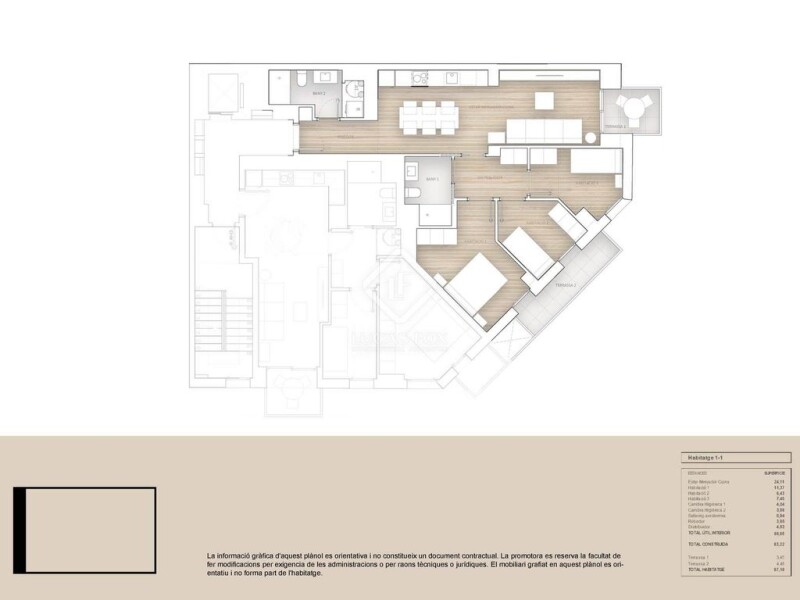 This charming apartment is located on the fourth floor of the Castillejos Sant-Pau building. With its 83 m² and 28 m² of outdoor space, it redefines the residential experience and the concept of refinement and functionality. It has three bedrooms and two bathrooms, and a northeast exposure, maximizing the sun and providing a bright and welcoming atmosphere. Upon entering, we are welcomed by a practical kitchen that blends harmoniously with a bright dining room living room and an exterior terrace, a private corner to enjoy the outdoors. The night area features a clever layout , consisting of a main bedroom with an en-suite bathroom and a second single bedroom , both with access to the same large balcony. The apartment also features an additional single bedroom and a second separate bathroom for added convenience and privacy. The property also features an exclusive 20 m² private terrace on the building's rooftop, offering stunning panoramic views of the city and an ideal space to relax and enjoy Barcelona's sunny climate. High-end finishes and meticulous attention to detail define the essence of this home, reflecting a commitment to excellence. Ultimately, this property perfectly combines functionality and style in a strategic location. Don't hesitate to contact us for more information about this exceptional property and discover the uniqueness of living in Castillejos Sant-Pau.