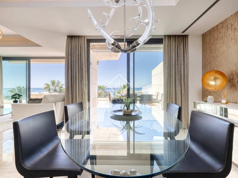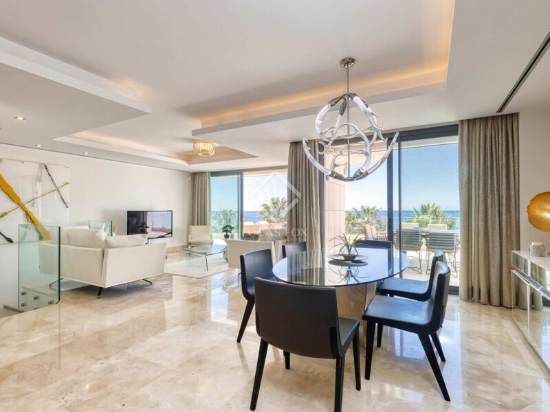 Discover the ultimate in luxury living with this stunning 3-bedroom duplex located in the exclusive Les Rivages building, offering direct access to the beach. Situated frontline beach next to Estepona Port, this property combines breathtaking sea and pool views with unparalleled convenience. Step into an elegant and very spacious living room and dining area, seamlessly connected to a large terrace that boasts wonderful views of the sea and garden. This space is perfect for both relaxation and entertaining guests. The property features three large bedrooms, each equipped with fitted wardrobes for ample storage. All bedrooms have access to the South- facing terrace. The fully equipped kitchen is a chef's dream, featuring top-quality Gaggenau appliances. Experience modern comfort with underfloor heating, hot/cold air conditioning, and Climalit double glazing in the windows. The home automation system ensures ease of living, while the inclusion of three parking spaces and a large storage room adds to the convenience. This beachfront duplex in Les Rivages is the perfect place to relax with stunning sea views while remaining close to all amenities. Whether you’re looking to enjoy the vibrant local scene or unwind by the beach, this location offers the best of both worlds. Don’t miss the opportunity to own this luxurious beachfront property in Estepona. Contact us today to schedule a viewing and make this dream home yours!.