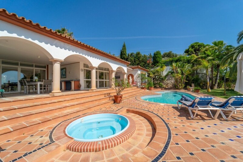 Nestled in the prestigious private community of "El Rosario" in Marbella East, this villa embodies the charm of traditional architecture. Positioned on two (2) spacious plots with a total size of 2648 m2, its location provides first line golf views, while being centrally located for easy access to amenities and nearby beaches. The plots are extremely well placed in a cul de sac ensuring privacy from neighbours. The villa features 3 bedrooms and 2 bathrooms, with approx. 325m2 of built area including 40 m2 in an independent basement that can easily be converted into additional bedrooms or a guest apartment. At the heart of the residence we can find a pool & hot tub seamlessly integrating indoor and outdoor living areas. The expansive garden is filled with mature trees, lush vegetation and exotic palm trees from all over the world creating a peaceful ambiance. There is also an option to combine the plots, presenting a significant opportunity for further development amounting to a total built space of 874 m2. This property uniquely combines traditional elegance with modern convenience, making it an ideal choice for those seeking a tranquil retreat or an investment opportunity in the much sought-after El Rosario neighbourhood of Marbella.