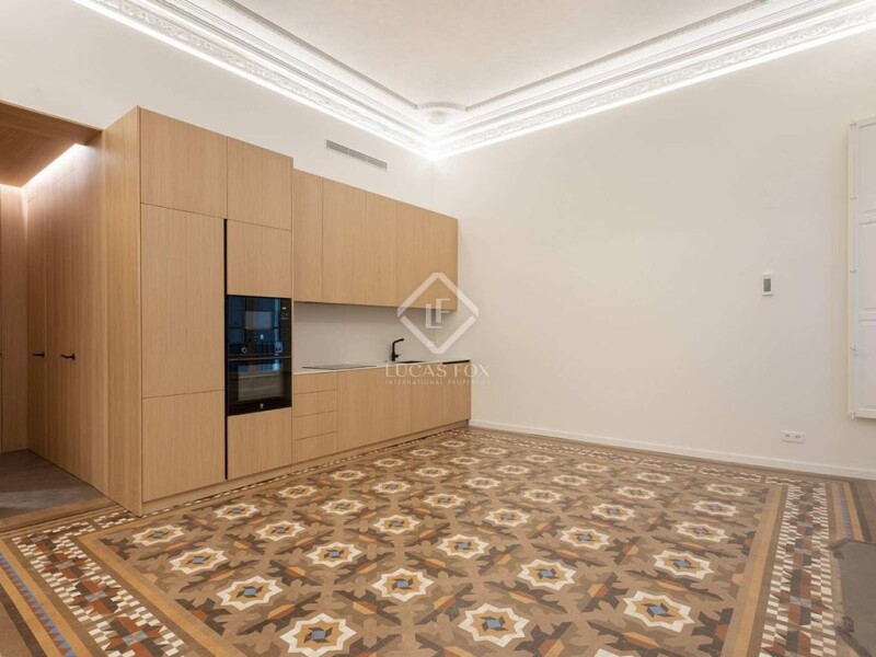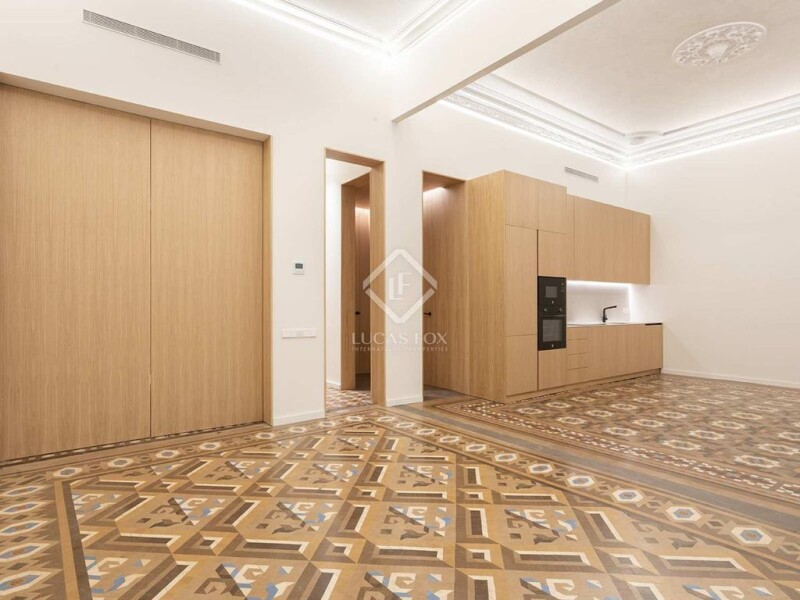 This 19th century building has been restored respecting the original grandeur, recovering the mural markings and highlighting its carriage entrance and a large interior patio. The elevator was installed in a way that did not alter the aesthetics of the building, inside a glass structure at the back of the central patio. This fantastic home is unique for its style and spectacular renovation. It consists of about 100 m2 and has 4-meter ceilings, a hydraulic system in perfect condition and recently renovated insulated windows. This beautiful apartment has a very intelligent layout: two bedrooms, two full bathrooms and a large day area, difficult to find nowadays. In this jewel of a home in the Gothic Quarter we find the large living room and open kitchen, both areas with two large balconies facing the street. The apartment has ducted air conditioning perfect for being comfortable both in summer and winter. The apartment consists of an open kitchen integrated into a spacious living-dining room, whose hydraulic mosaic floors are still preserved in magnificent condition, two very large and quiet double bedrooms (one of them with a private bathroom) and a complete bathroom for general use. Please do not hesitate to contact us for more information and/or to arrange a visit of this true gem of the neighborhood.