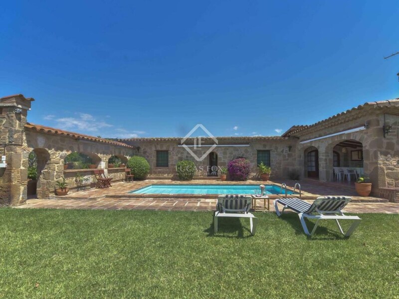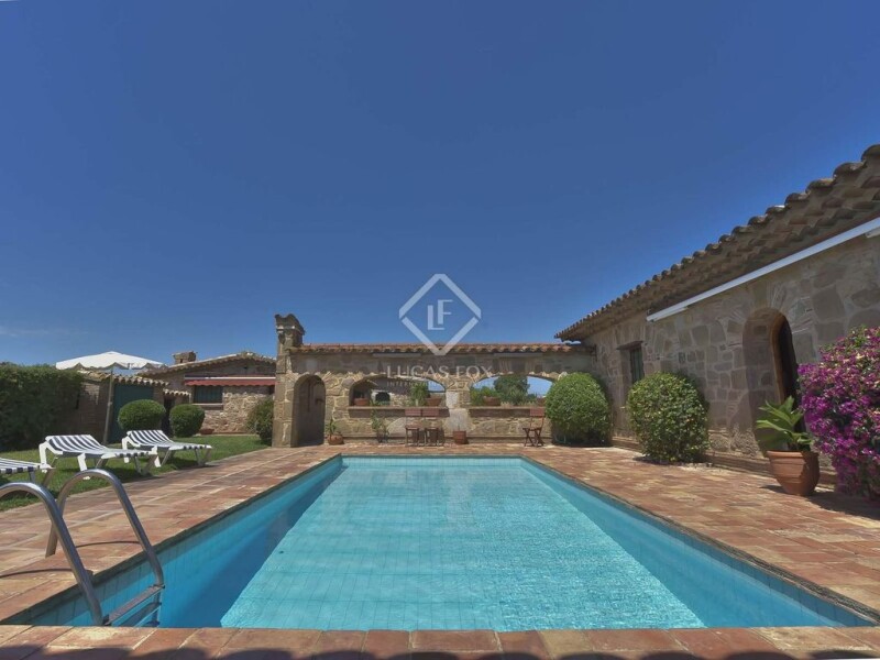 This unique property is located in the centre of Platja d´Aro and a few metres from the beach. The farmhouse has a built area of 414 m² distributed between two single-storey houses on a completely flat plot of 5,084 m². The main house has 179 m² with two bedrooms, a spacious kitchen, a living room with a fireplace, a complete bathroom and a beautiful interior patio. The estate has a second house of 103 m² with two bedrooms, a bathroom, a toilet, a kitchen and the covered terrace with a barbecue. It enjoys a beautiful 5,000 m² garden with a pool, from where you can watch fantastic sunsets, with total privacy. Finally, it has a 63 m² closed garage and a beautiful chapel that is currently used as a storage room.