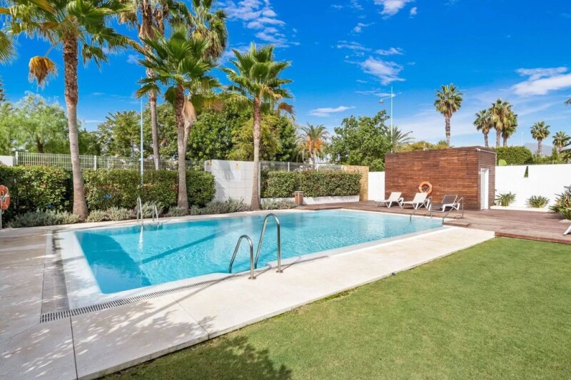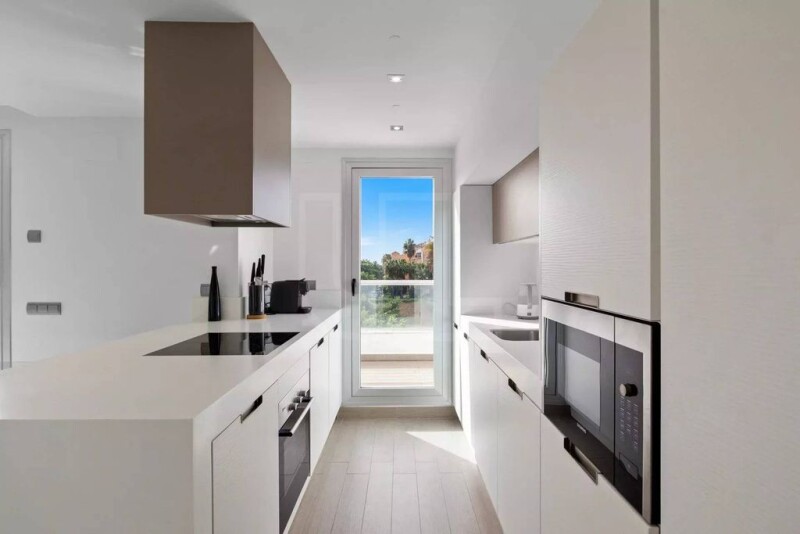 Modern penthouse apartment located in San Pedro de Alcantara, Marbella, set within the Jade Beach complex by Taylor Wimpey, known for its high-quality boutique-style developments. Situated a 3 minute walk to the beach and easy access to nearby restaurants, the new luxury health club, The i/O, and local shops as well as close proximity to international schools, sports facilities, supermarkets and hospitals. The 111 sq.m fully furnished apartment comprises an elegant hallway, a bright and spacious living / dining room, an open plan kitchen, laundry room, 3 bedrooms with built in wardrobes, 2 bathrooms and a large 25 sq.m terrace with ample space for sun lounging and outdoor dining. Additionally there is a rooftop area featuring an awning creating shade and offering great potential to add glass walls to make additional accommodation. Other features include air conditioning, underfloor heating, double glazing, 24 hour security, 2 parking spaces and a large storage room. The complex is beautifully landscaped with lush plants surrounding a secluded swimming pool area with sun loungers, showers and bathrooms.