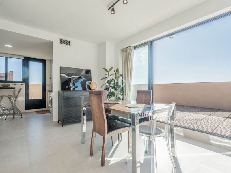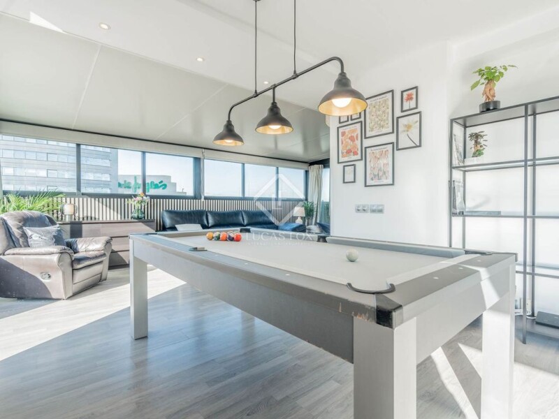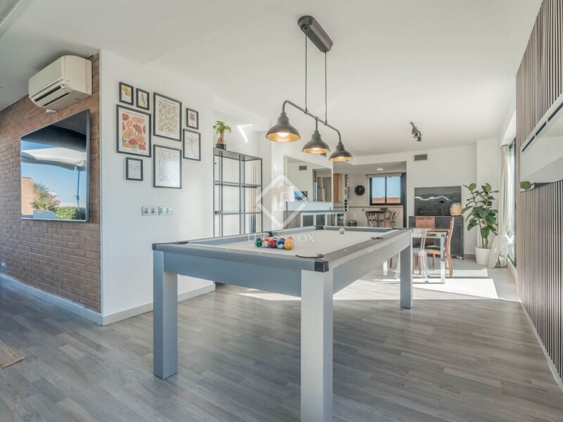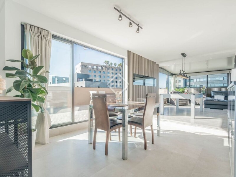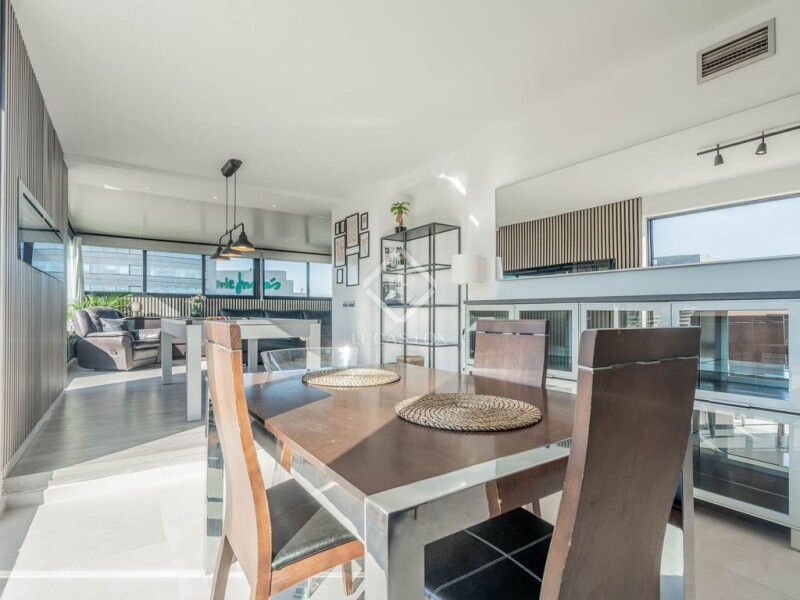 This unique penthouse is located in a modern building built in 2003, in a complex of the City of Sciences. It has all kinds of services, including a large swimming pool surrounded by grass, large green areas, a park and a swing area for the little ones, as well as a concierge and security service. This property of 120 m² is located on a high floor and has two spacious terraces that total more than 120 m² and surround the entire apartment. Both terraces offer impressive views of the City of Sciences, the port and practically all of Valencia. The main terrace also has a great southeast orientation, so it not only receives a lot of sun, but also enjoys the pleasant sea breeze. Being so spacious, it consists of several areas, with loungers, a dining table and a sun lounger. Without a doubt, an ideal place to take advantage of the incredible Mediterranean climate. Also, as they are located on a high floor and have no nearby buildings, the terraces offer great privacy. Upon entering the attic, a small hall welcomes us and, on the left, we find the kitchen, of a good size and with access to the terrace. Next, there is a large L-shaped living-dining room of more than 45 m², which is divided into several areas. This room also has a large windows and sliding doors that connect with the main terrace. The night area is clearly differentiated from the day area. It offers the main bedroom, with large closets and its private bathroom; two more bedrooms, all of them with built-in wardrobes; and another bathroom with a bathtub complete the distribution of the night area. All bedrooms have large doors that allow access to a second terrace of approximately 30 m². The apartment is equipped with oak interior carpentry, double glazing and thermal and acoustic insulation, air conditioning through ducts and motorized awnings. It also includes a large garage space, with enough space for a car and a motorcycle.