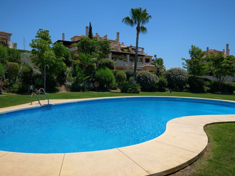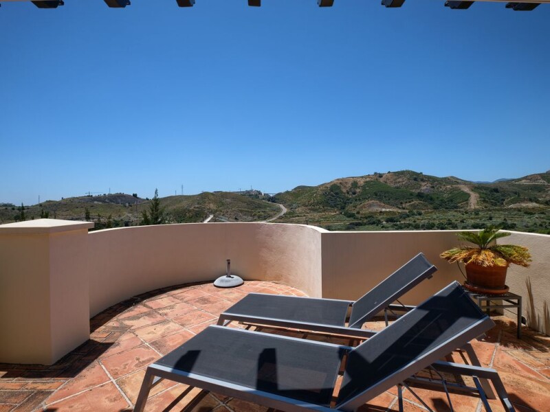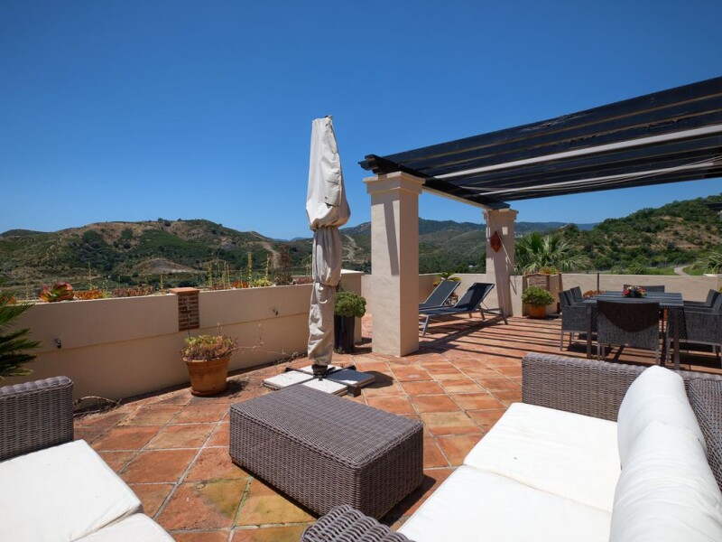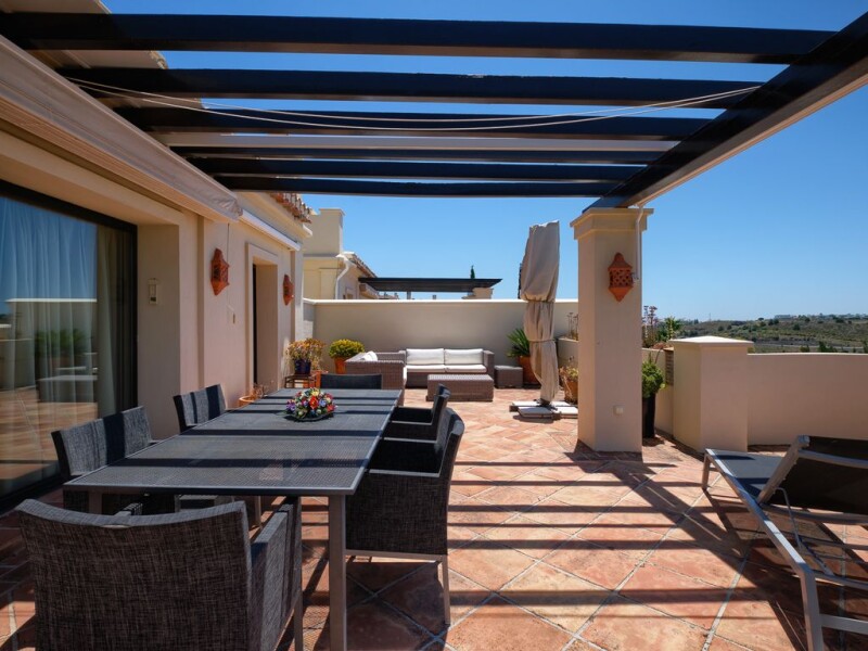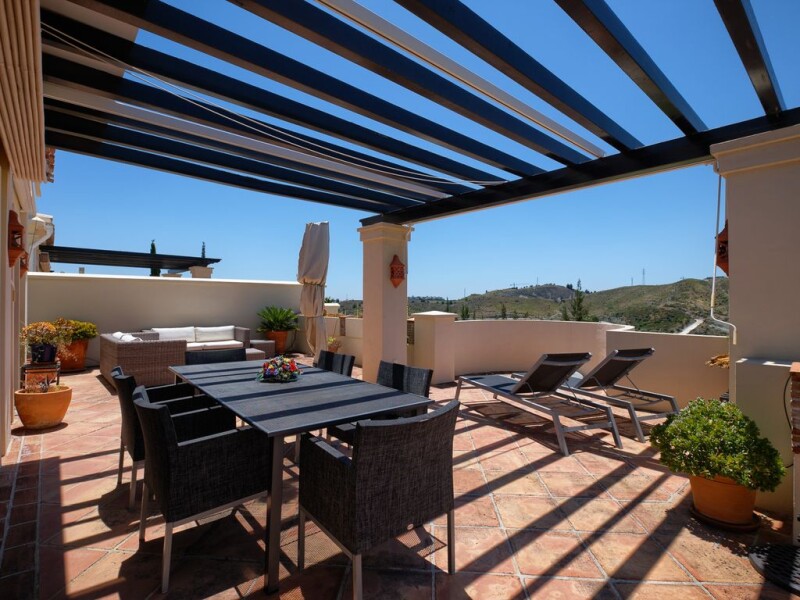 Beautifully located duplex penthouse in Capanes del Golf. South-West orientation with views to the golf and mountains. Gated with 24hrs security. Close to all amenities. Main floor: Entrance hallway, living and dining area with fireplace, fully fitted kitchen with Siemens appliances, two guest bedrooms en suite and separate guest toilet. Direct access to the spacious terrace. Upper floor: Master bedroom en suite with dressing area and terrace. Two parking spaces and a storage room. Several community pool and a heated indoor pool. Fitness area and a social club. A/C with heating, under floor heating in the bathrooms.