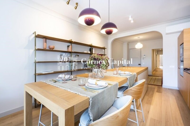 Magnificent renovated flat with a terrace a few meters from the Plaza de Francesc Maciá, in the Les Corts neighborhood. Bright flat with double orientation, east and west, so it enjoys morning and afternoon sun. It has an area of 175sqm built and 170sqm useful, distributed in 4 bedrooms (three of them double), spacious living room, kitchen, 2 full bathrooms and 1 toilet. It has access to the patio. The home has a terrace with enough space to place a table with chairs. Equipped with heating and air conditioning. Built-in wardrobes. It has a storage room. Located on the 3rd floor of a building with an elevator. Very good location, close to all services, leisure and restaurant areas, parks and gardens and very well connected to public transport. Reform customization option. Cornex Capital accompanies you to visit this renovated flat in Les Corts!.