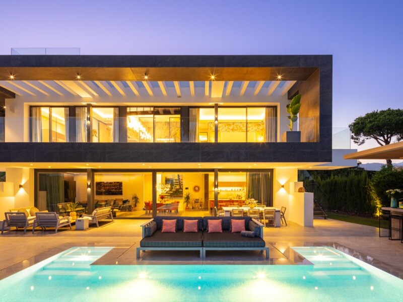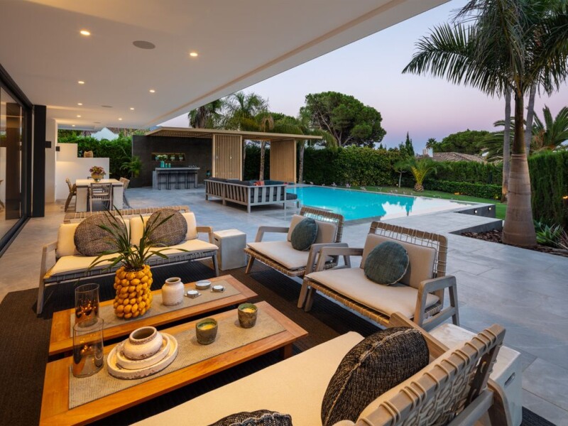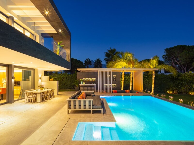 Welcome to Villa Maria, a sleek and contemporary home in the heart of the popular residential area of Nueva Andalucia with dramatic views of La Concha and down to the sea. The property has stunning modern architecture, blending different natural materials and all the latest technology for optimal comfort, including a complete Smart Home domotics system and underfloor heating. The villa embraces life in the Andalusian climate. South facing it has generous terraces areas totalling 180 m2, well equipped outdoor kitchen with bar style seating, swimming pool and jacuzzi and beautifully manicured gardens. Villa Maria delivers a luxury lifestyle, with special features including a gym, spa area and wine cellar.