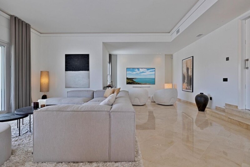 Villa Ibiza: Stunning villa in Nueva Andalucia, Marbella Villa Ibiza: Renovated luxury villa for short-term rentals and sale in a prime location, Nueva Andalucía, Marbella. This precious property is located in the heart of the prestigious Golf Valley, a private and quiet area, ideal for people looking to enjoy their holidays in a calm area but close to Puerto Banús and all its luxury. Here you will enjoy access to sophisticated golf courses, international schools, shops, and more. The villa has 3 levels and offers prime entertainment areas. On the main floor, there's a grand entrance hall with access to a spacious living room with a gas fireplace, a dining area, a modern fully equipped kitchen with high-end amenities, a guest bedroom, and an elevated terrace. The first floor exclusively belongs to the marvelous master bedroom, the dressing area, a private bathroom, and a private terrace with wonderful golf views. The ground level features three guest bedrooms with two bathrooms, a multipurpose family room with a bar, laundry room, kitchenette, wine bodega, and a double garage. An ideal property to enjoy with your family, friends, or big groups. The distribution is comfortable and privacy is present in every room of the house.