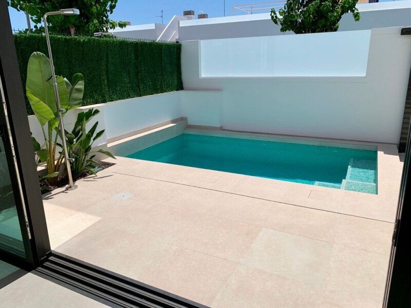 New Build residential of villas and townhouses in Serena Golf, Los Alcazares. Modern townhouses has 3 bedrooms, 2 bathrooms, open plan kitchen with living area, terrace, solarium, private garden with the pool and parking space. Fully fitted kitchen in white gloss or wood colour. Technological technological quartz. Stainless steel sink. Induction hob with integrated extractor fan, oven, microwave, washing machine, integrated refrigerator, integrated dishwasher. Air conditioning: Complete installation with FUJITSU ducts. Swimming pool: Dimensions according to the property, with steps, blue ceramic tiles and white LED lighting. Pre-installation for heat pump. La Serena Golf is located in the municipality of Los Alcázares, occupying an area of 60 hectares on the edge of the Mar Menor, a perfect natural environment to enjoy the best climate in Europe. Los Alcázares located in the Region of Murcia near the beaches of Mar Menor, where you can practice various water sports, surrounded by several golf courses. Here you can practice various water sports, surrounded by several golf courses and the city of Cartagena less than 15 minutes by car and 22 km from Murcia airport, therefore having a wide cultural, gastronomic and sports offer within reach.