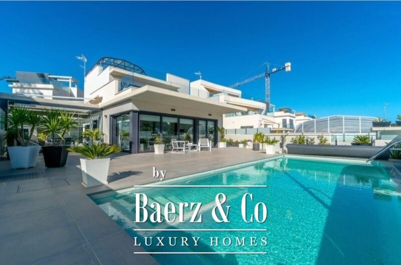 Campoamor, Modern luxury villa with a 479 m2 plot and a 234 m2 house with 3 bedrooms (2 of which are on the ground floor), 3 bathrooms, large living room, kitchen with island, large terrace, private pool, solarium with glazed area and jacuzzi with sea views, barbecue area, sold furnished, with parking space on the plot and is walking distance to aguamarina beach.