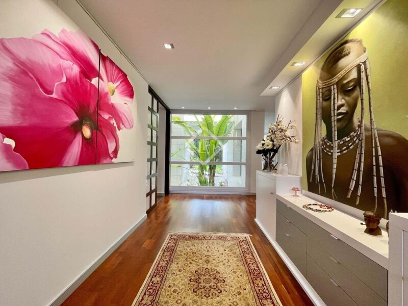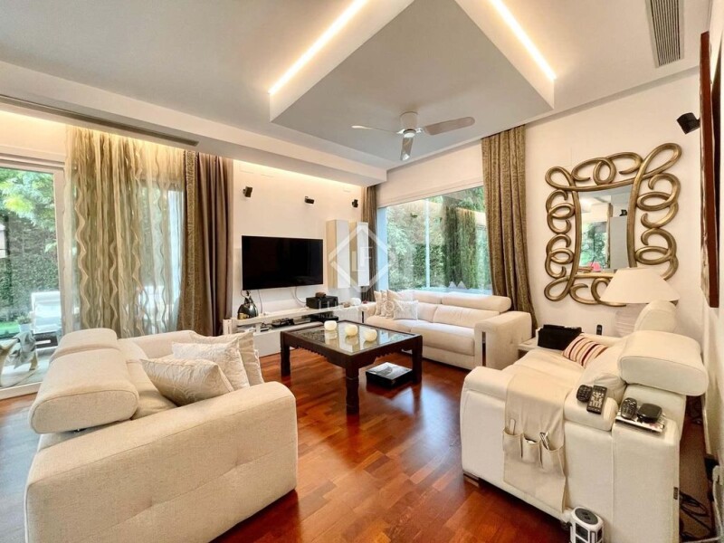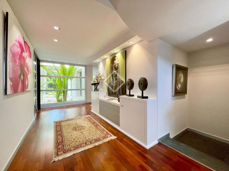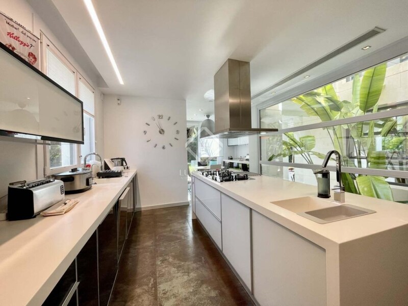 High-end quality villa in a quiet and discreet location, 10 minutes away from San Juan beach. This is how you might describe this magnificent 5-bedroom villa, located on a plot of land of 1,200 sqm in Les Paulines, Alicante. Passing through the main gate we realize that we are looking at one of the best private properties in Alicante - the garden that surrounds the house is full of natural grass, flowers, plants, palm trees and a very old olive tree as well. Entering the house through the main door, we are amazed by the double height, majestic entrance hall that takes us to all the areas of the home. First of all the well lid dining area connected to the kitchen, the living room area with its fireplace and huge exterior space connected by large sliding door. Then, the amazing spacious kitchen with cooking island and designated space for the breakfast table which has connected a pantry and a laundry area. Here we find the electronic control panel of the entire property from lighting system to temperature, electrical blinds, security, watering system etc. On the other hand on the same floor we have a bedroom used as an office, a complete bathroom, the lift area and the stairs that takes us to the first floor - the resting area. The main area of the first floor is the 100+ sqm master bedroom with its sleeping area, 2 private dressing rooms and bathrooms and a sunny terrace with a lovely view towards the surroundings. On the same floor, there are 3 more double bedrooms and 2 bathrooms. The second floor is a technical terrace where the solar panels for heating the water and solar panels for generating electricity are located. By the help of these the property is almost self-sufficient all year long. Going down to the lower ground floor, we have: a living room, an area that could be used as a bedroom, a gym, an area for a sauna, the huge triple garage and a technical room - the area for treating the water and the heating and cooling system. As we stated before, this is a villa with several security systems, with full security windows and doors, great quality finishings and appliances and, very important, everything made on the basis of a project that can be presented and delivered to the buyer. Another important feature is the pool and the summer kitchen next to it - a great place to have fun with friends and family all year long. If you feel this breathtaking villa ticks all your boxes, please call us to arrange a viewing.
