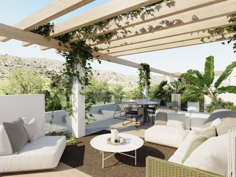 This new villa is part of the Font de Llop Village new-build development, located on the first line of the golf course by same name. In general, the area is surrounded by several golf courses and garden areas, ideal for families who wish to practice or improve their golf. The setting is excellent, as it has a wide range of restaurants, golf courses on various courses and a mini-market; all designed to provide the owners with all the necessary comforts. The 140 m² new-build villa is spread over 2 floors and offers unobstructed views that will give you a feeling of peace and tranquility. On the ground floor, there is a day area with a living-dining room with an open kitchen equipped with a microwave, induction hob, multifunctional Inox oven and dishwasher. This open-plan room benefits from a modern style with large windows in the living room area that allow plenty of natural light to enter the house and lead to the covered porch and private pool. On the same floor, there are two bedrooms, including the master bedroom with a dressing room and a double bed. Finally, the first floor consists of a bedroom, a modern bathroom equipped with a shower and window, and a solarium. This villa can be equipped with a private pool, solarium, private uncovered parking and garden with palm trees. The area has plenty of vegetation with native species that protect the bioclimatism, absorb CO2 emissions and renew the air. Please get in touch for more information.
