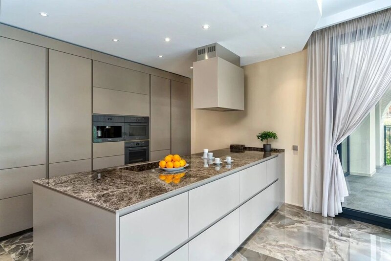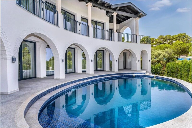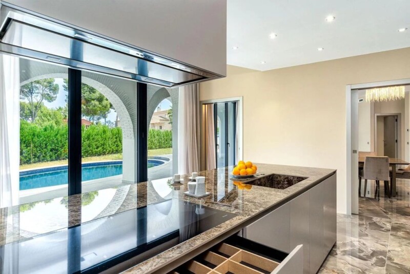 BARNES presents a stunning villa in Torre Valentina of 744 m² on a plot of 981 m² with 5 bedrooms, 8 bathrooms and many additional areas. The ground floor features a spacious living and dining room with panoramic windows. They connect to the crescent-shaped porch and open onto the garden. The custom Italian kitchen features Miele appliances, pantry and service kitchen. Also on this floor you will find - master bedroom with bath, porch and laundry room. On the second floor there is a master bedroom with dressing room and bathroom, three bedrooms with en-suite bathrooms and access to the terrace. An external staircase leads to the terrace with panoramic sea views. The basement offers a cinema, gym, sauna and a garage for 4 cars with charging station for electric cars. The house is equipped with triple glazing, ceramic floors, underfloor heating, air conditioning, solar panels, water softening system, swimming pool and automatic garden irrigation. This house combines modern design, technology and convenience in one of the best locations on the Costa Brava.
