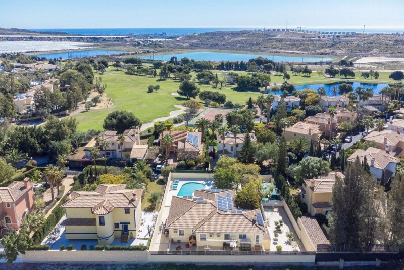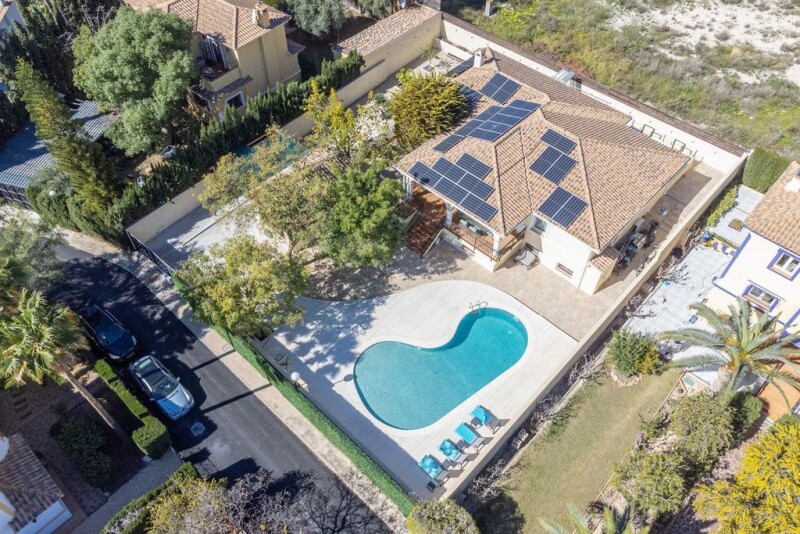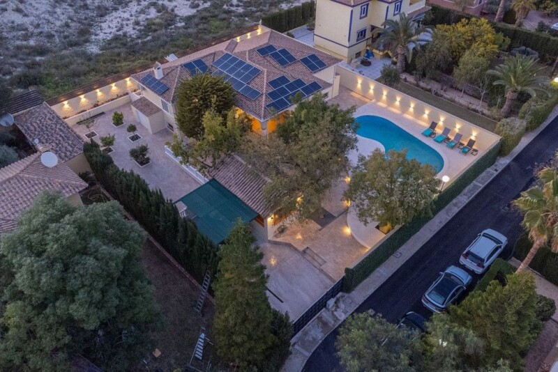 Exclusive Villa in Bonalba Golf: Luxury, Comfort, and a Privileged Setting Located in the heart of the prestigious Bonalba Golf residential complex, this spectacular villa offers the perfect blend of elegance, comfort, and nature. Nestled within a gated community with 24-hour security, lush gardens, and a renowned golf course, it provides a peaceful and sophisticated lifestyle just 15 minutes from Alicante city center and 10 minutes from the best beaches of the Costa Blanca. Upon entering the property, an elegant foyer welcomes you with a sense of distinction. The villa features five spacious bedrooms, one of which has been converted into a walk-in closet, ensuring privacy and comfort for the entire family. Additionally, there is a separate guest studio with its own private bathroom, ideal for hosting visitors in total comfort. The four bathrooms are designed with high-end materials, combining style and functionality. The modern kitchen, fully equipped with high-quality French appliances, is a space designed to inspire culinary creativity. Adjacent to it, the main living room exudes warmth and sophistication, featuring an exclusive English-style bar and an in-home cinema, perfect for entertainment without leaving the house. On the lower level, a fully equipped gym with its own bathroom provides the perfect space to stay active. Both the gym and the studio are fitted with air recovery systems, ensuring optimal ventilation and air quality. The outdoor area of the property is a true private oasis. A meticulously designed 922 m2 garden boasts fruit trees, colorful flowers, and shaded areas for relaxation. The saltwater swimming pool, surrounded by elegant polymer decking, offers the perfect retreat on sunny days. Overlooking this serene setting, a spacious 32 m2 covered terrace provides breathtaking views of the pool and garden, creating an ideal spot to unwind at any time of the day. To maximize outdoor living, the home also features a luxurious glass-enclosed pergola, fully equipped as a relaxation area, and a climate-controlled glass terrace, perfect for year-round enjoyment. A dedicated barbecue area invites you to host unforgettable gatherings with family and friends, while perimeter lighting around the patio creates a warm and inviting nighttime atmosphere. Designed with every detail in mind, the property includes a fenced area specifically for pets, ensuring their comfort and safety. For children, the community offers playgrounds, a communal swimming pool, and a tennis court. This villa also stands out for its energy efficiency and commitment to sustainability. Equipped with 24 solar panels (10 kW) with battery storage, it provides total energy autonomy and even allows for surplus energy sales. The double-circuit electric boiler ensures efficient heating and hot water, while an advanced water filtration and purification system guarantees high-quality drinking water. Additionally, the home features mosquito screens on all windows and a fast-charging station for electric vehicles. Located in an exclusive area with access to sports facilities, fine dining restaurants, and stunning natural surroundings, this property offers an unparalleled quality of life. From a peaceful breakfast on the glass terrace to an afternoon of golf followed by an evening at your private bar, every corner of this home is designed for maximum enjoyment. A unique opportunity for those seeking exclusivity, comfort, and the perfect connection to the Mediterranean lifestyle. Contact us now to arrange a viewing and discover this stunning villa in Bonalba Golf.