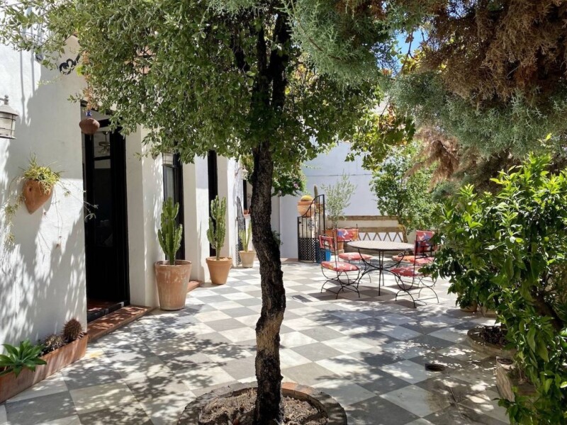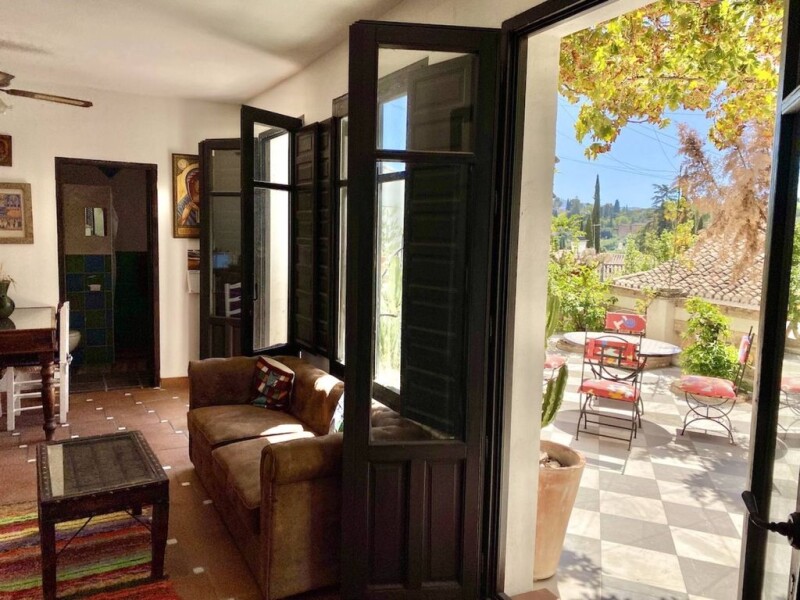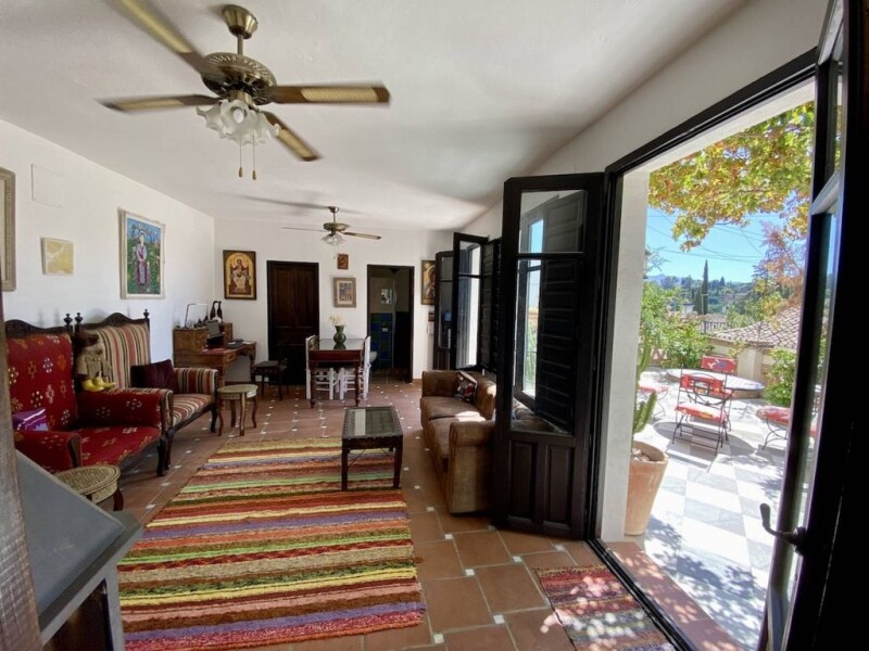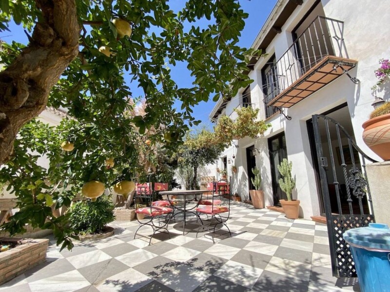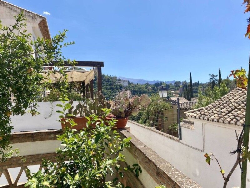 Located in Granada's historic Albayzín district, this exceptional townhouse offers panoramic Alhambra views from three private terraces. Entirely rebuilt in 2005, this thoughtfully designed home combines modern comforts with traditional Andalusian charm. The house, built around a classic Andalusian patio, is arranged across multiple levels. Upon entering from the street, a charming staircase leads to a terrace with two cypress trees, five orange trees, a pomegranate, a small cork oak, an apricot and two vines which provide shade in summer. This terrace, which sits substantially higher than the street below, is spacious and an ideal place to take meals. Directly off the terrace is the lounge. With three double French doors to the terrace, the lounge is filled with light. Off the lounge there is a bathroom and a storeroom. Passing through the lounge into the hall, there is the spectacular kitchen with a central island and, unusually, two hobs, one in each corner. There is a breakfast bar built into the island. The kitchen work surfaces are all of granite. The oven is commercial sized, there is a fridge freezer, washing machine and dishwasher. Accessed from the kitchen is a cave which serves as wine cellar and pantry. Double doors from the kitchen open onto the patio, across which is the dining room which also has a sink, refrigerator and induction hob. Stairs from this room lead up to a single bedroom with en-suite shower room. This wing of the property can be accessed directly using the door at the top of the entry stairs and can be made separate if desired. Also located in the patio is a former toilet which now houses a second washing machine and two doors giving access to the hot water tanks. Access to the cave area is also from the patio. Attractive brick arches lead to the lounge, three double bedrooms and a bathroom witha Moorish style sunken tiled bath. A fan with ventilation pipes maintains the caves completely dry at all times. There is no humidity and the caves have no odour associated with damp environments. On the first floor accessed by a marble staircase from the hall is the spectacualr master bedroom with three double French doors overlooking the Alhambra and an en-suite bathroom. The bath is positioned under the window for optimum Alhambra views while bathing! The master bedroom enjoys access to the rear patio and, via a flight of steps, to its own privated terrace with views of the Alhambra, the Generalife and the Sierra Nevada. The rear patio has stairs which lead to the largest and highest of the terraces with dining table and marvellous 180º views across the Albayzín, the Alhambra and the Sierra Nevada. From this terrace there are steps up to a door to the street behind which has vehicle access so is ideal for unloading heavy items. Siuated in a quiet street within a few minutes walking distance of all services in the Albayzín, it is also only twenty minutes easy walking to the centre of the city. Walking down is easy, walking back up less so, but there is a bus which stops nearby to do the work for you. .