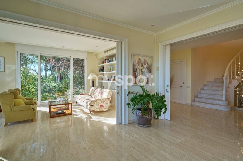 Located in one of the most distinguished enclaves of Sitges, this extraordinary estate stands as an unrivaled jewel. Enjoying commanding views over the golf course and the sparkling sea, this property is situated in a select urbanization, guaranteeing an exclusive and privileged position.~~With an area of 2,377 m2, the estate offers a captivating space, where every corner has been meticulously landscaped and cared for. The majestic house, with its 910 m2 built, stands as a testimony of architectural quality and exceptional construction.~~~Together with the villa plot you can acquire two neighboring plots with a total area of 2400m2, buildable with a 540m2 detached house. Today it is the villa's botanical garden with many exceptional plants that guarantees a high level of privacy. Interested in selling it together with the property. Ask us for the full price.~~~From its central position on the plot, the house rises elegantly, offering panoramic views from every corner. The main floor, with pedestrian access from the outside or by means of an imposing staircase and elevator from the parking lot, reveals a careful distribution. A fully equipped kitchen with a separate service entrance, an office with own bathroom, living room, dining room and a library, all of them with access to the covered terrace with panoramic sea-views. ~~On the upper floor, accessible through a magnificent staircase, the sanctuary of the bedrooms unfolds. Four of the five double bedrooms are located here, each one with bathrooms en-suite and the 80 m2 master suite as an example of luxury with two dressing rooms, generous bathroom with a Jacuzzi tub and shower, and a terrace offering the best views in the house.~~The ground floor not only houses the spacious garage with capacity for eight cars and several motorcycles, a fifth double bedroom with en-suite bathroom, practical spaces such as a gym, sauna, dressing room, wine cellar and archive but also the central control of the underfloor heating installations, air conditioning and irrigation of the property.~~~The emphasis on quality is evident in every detail. The aluminum windows with thermal break, the lifting sliding balcony doors, and motorized blinds and all the windows with shutters guarantee not only exceptional energy efficiency, but also dazzling views from the interior. The house was constructed in 2004 with a solid reinforced concrete structure. High-quality facilities such as ducted air conditioning, underfloor heating and an industrial air conditioning machine ensure unrivaled comfort. A water softener and osmosis system for kitchen water add an extra layer of convenience.~~The outdoor area is its own paradise, with a pool that merges with the horizon, jacuzzi, two bathrooms and storage rooms. The exquisite landscaping, irrigation systems and the diversity of trees and palms, all in an impeccable state of conservation, create an oasis of tranquility and beauty.~.