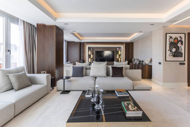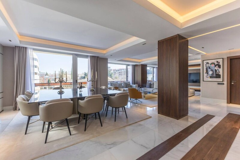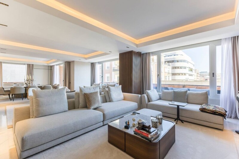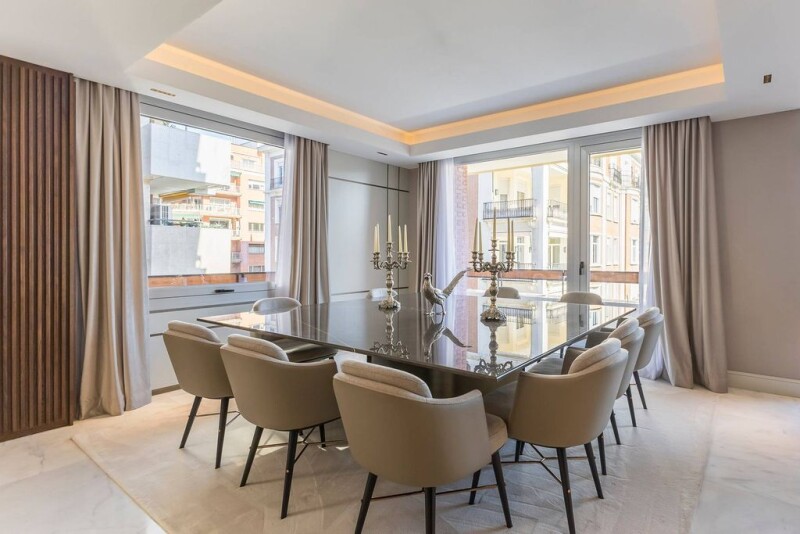 Located in one of the most prestigious areas of Madrid, this spectacular 414 m² home offers a sophisticated and comfortable lifestyle. Completely renovated and furnished brand new, it combines noble materials and cutting-edge technology in a spacious and light-filled space. Thanks to its corner location, the apartment has large windows with double orientation, providing exceptional lighting and unobstructed views. The layout has been designed for maximum comfort, with a large open concept living-dining room, featuring finishes in dolomite marble and natural oak wood. The kitchen, with an impressive central island, is equipped with state-of-the-art appliances. It has four elegant en suite bedrooms, plus a guest toilet. The property incorporates exclusive details such as custom furniture from Italian brands, walls covered in high-quality materials, and advanced technological systems, such as Casambi lighting control and B&W sound system. High ceilings and careful selection of finishes enhance the feeling of luxury and warmth in each room. Located in the Castellana neighborhood, within the Salamanca district, this home is surrounded by exclusive boutiques, high gastronomy restaurants, and some of Madrid's most emblematic cultural landmarks. Its combination of prime location, impeccable design, and advanced technology make it a unique opportunity for those seeking an exceptional residence.