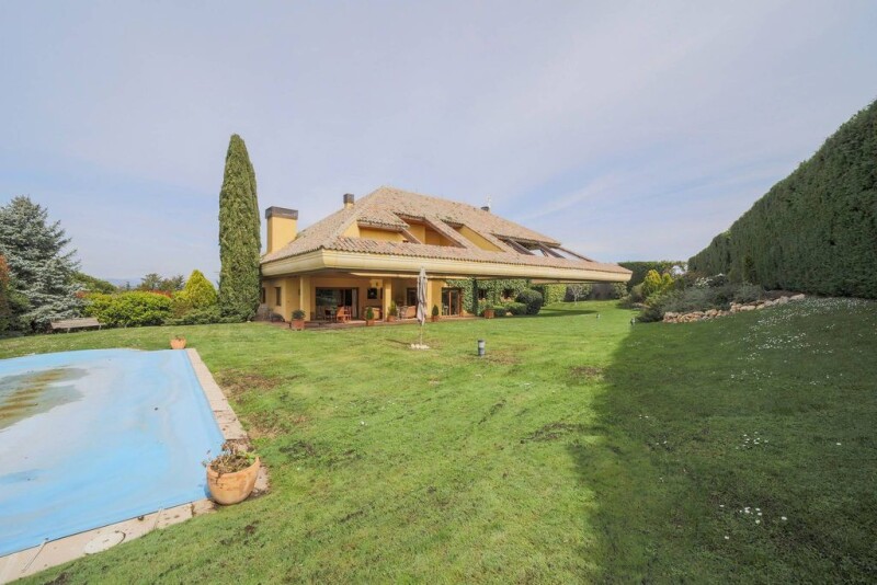 The villa is located in the urbanization Ciudalcampo, a luxury residential housing development located 20 km north of Madrid city center and 20 minutes from Adolfo Suarez Airport. Magnificent detached villa in a privileged area of Ciudalcampo, with high-quality construction, a huge and well-kept garden, and stunning views. It is in impeccable condition and you can even add more meters since it has a spacious attic without enabling. Ideal for families who want to enjoy space and privacy. The house, with 480 m2 built, stands within a set of two united plots (one of 2.535 m2 and the other of 2.503 m2) that make up a total surface of 5.038 m2. Layout: It has 5 bedrooms and 4 bathrooms (including service quarters) and its distribution is as follows: The main floor is articulated from an entrance hall which gives way, on the right, to a stately office/library and, on the left, to a guest toilet and a walk-in wardrobe. From the hallway, we enter the living room, which has a fireplace and access to a lovely south-facing porch overlooking the pool area of the garden. To the right of the living room is a cozy sitting room, while to the left is the dining room, which also has access to the porch. The dining room communicates with a modern kitchen with an office and south orientation. The service area, which consists of a bedroom with a bathroom laundry, and ironing room, is also located on this level. The first floor houses the sleeping area, consisting of four bedrooms. The master bedroom has a sitting room, a large dressing room, and an en-suite bathroom. A second bedroom has a dressing room and bathroom, while the remaining two bedrooms (one of which is currently used as an office and has a fireplace) share a further bathroom. This floor has two terraces, a winter terrace with views of the Cuenca Alta del Manzanares Regional Park and a summer terrace with views of the mountains of Madrid. The lower part of the property is occupied by a garage for two cars (three more can be parked outside) from which there is access to the kitchen and three spacious storage rooms. The garden is spectacular and is divided into two very different areas. One is more rugged, with a multitude of holm oaks facing north, and the other is very consolidated, with a large number of trees, lawns, and a beautiful swimming pool, facing south. The heating is propane gas by radiators (the tank is exquisitely camouflaged by ivy in the garden) and there is centralized air conditioning by ducts throughout the house (it can be sectorized).