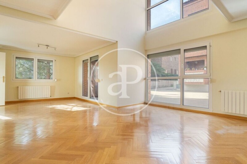 AProperties offers for sale this magnificent ground floor duplex in Pirineos street, very bright and with all the rooms very spacious. It is a duplex of 286 m², of which 238 m² of living space and 47 m² of fantastic communal areas. The ground floor consists of a spacious living room with double height ceilings which gives it a great category and amplitude, a good sized kitchen with clothesline, a service area with bedroom and separate bathroom and a sleeping area consisting of two bedrooms, one of them with en suite bathroom, two windows and terrace with pleasant views, the second bedroom very spacious and with plenty of storage, also has another bathroom. On the upper floor, very bright, we find some wardrobes with plenty of storage, another living area with a nice viewpoint to the main living room and access to a good sized terrace to put a table. The sleeping area has two further bedrooms, one en suite and the other with a full bathroom. The communal areas are landscaped and spacious and the swimming pool is of a very good size. The high ceilings and double height in the living room, the spaciousness of all the rooms and the comfort and independence of the two floors make it a very special and cosy property for families as well as for those who want to invest in one of the most elegant areas of the capital. The house has a large amount of wardrobes and storage as well as a large storage room of 14 m² and two parking spaces. It is a unique opportunity to live 10 metres from the Dehesa de la villa park, which allows you to enjoy the countryside and the outdoors while being 5 minutes from the centre of Madrid. Can you imagine living here? .