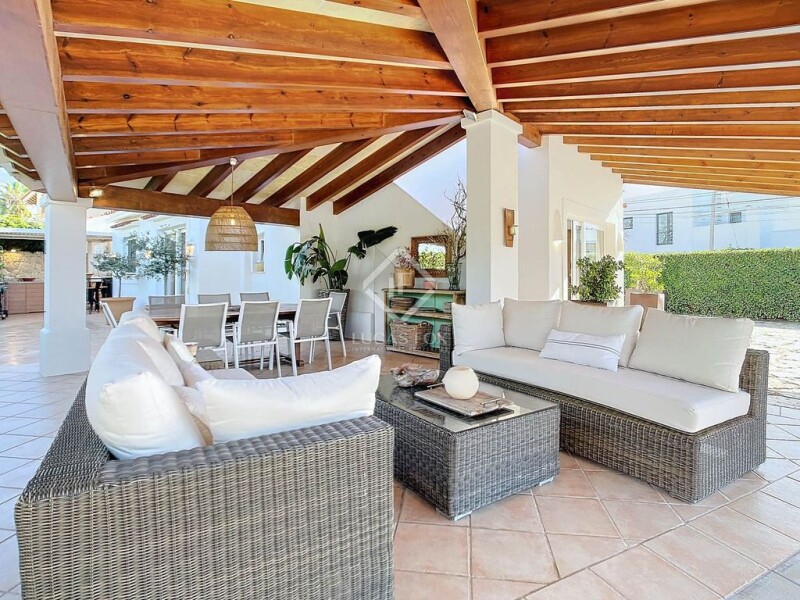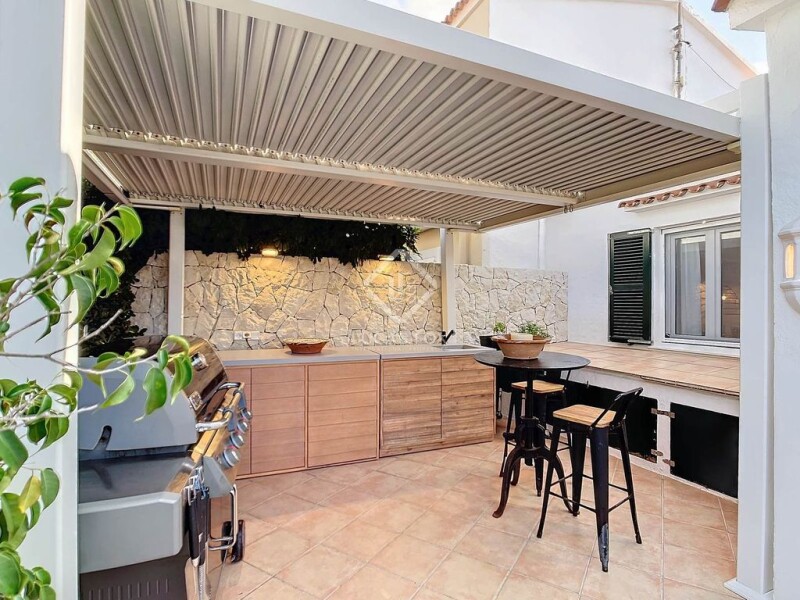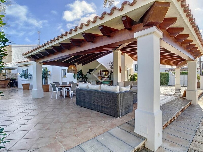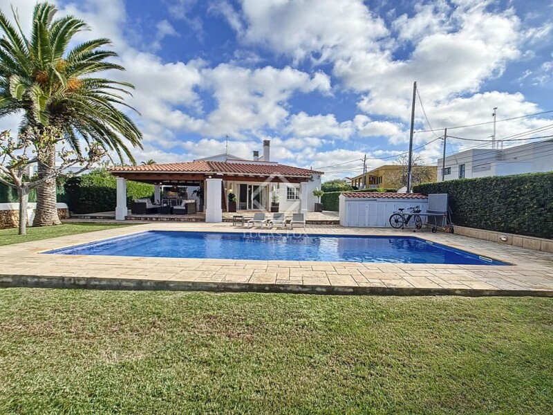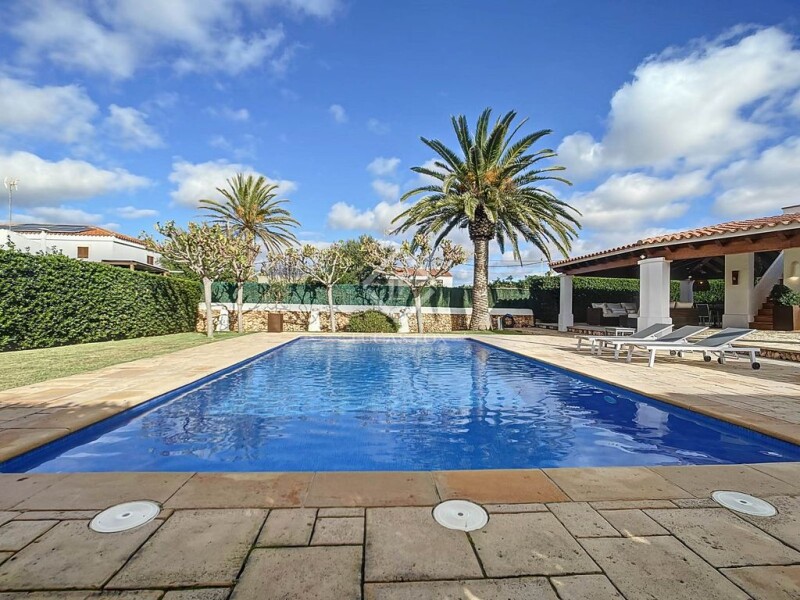 Lucas Fox presents this wonderful 156 m² villa , which is distributed on a ground floor on a 800 m² plot in the prestigious Son Oleo development . It is located close to the city beach, in the municipality of Ciutadella de Menorca. The property is surrounded by a spectacular covered porch and welcomes us with a charming entrance hall. Once inside, there is a cozy living room with a fireplace and large windows that allow plenty of natural light to enter the entire room and offer views of the pool and access to the garden. From the entrance, we also find a large dining room also with a fireplace and access on one side to the barbecue area with a bioclimatic pergola, which is equipped with a refrigerator. On the other side, it gives us access to the impressive covered porch with exposed wooden beams and sandstone with a splendid dining area and living room area, ideal for enjoying with family or friends outdoors. From the dining room, it connects to the fully equipped kitchen with high-end appliances . Adjacent to the dining room, we have a double bedroom with several built-in wardrobes, a private bathroom and access to the porch and the garden . A corridor leads us to the main bedroom, another double bedroom and a single bedroom , currently used as an study, all with built-in wardrobes that share a large bathroom. The house was built with high quality materials. It has exposed beams in the living room and one of the bedrooms, exposed wooden beams in the dining room and kitchen, heating by low consumption electric radiators in all rooms, heated towel rails in the bathrooms, ceiling fans and mosquito nets in the bedrooms, double exterior insulation, PVC exterior carpentry with double glazing, perimeter alarm system and automatic irrigation. Exterior, we find a staircase that leads to the roof terrace with the right to fly, a splendid 56 m² swimming pool surrounded by a paved solarium area, a storage room that can be used as a machine room, a garden that surrounds La Finca and an exterior garage. Without a doubt, an ideal villa to live all year round or spend time with family or friends, thanks to its proximity to the city centre and access to the Sa Platja Gran bathing area. Please contact us for more information or to arrange a visit.