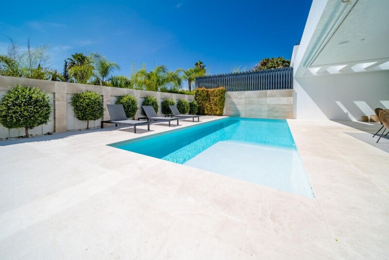 Modern Villa for sale in Altos de Puente Romano, Golden Mile, Marbella Introducing a brand new designer villa for sale in one of the best places to live in Marbella. Located right above one of the most sought-after areas of the Golden Mile, Altos de Puente Romano, Golden Mile, Marbella. This area has the highest-level security, with 24h security service and beautiful surroundings. The incredible villa is situated in the heart of this prestigious zone and next to many luxury shops and restaurants, as well as the renowned Puente Romano Hotel, all while being within just 15 minutes walking distance of the beach. The villa has a beautiful modern design that features some Scandinavian details. Distributed on two levels plus a gorgeous solarium and a basement. The ground floor of this house is surrounded by incredible-sized terraces with access to the garden and swimming pool. On this floor, you will also find the open plan living room and fully fitted kitchen. Through the hall, you will arrive at a charming guest bedroom en-suite. The main feature of the first floor is the incredible master suite, the beautiful space distribution, as well as the high-end bathroom and the private terrace, make it exceptional. This floor is completed by two guest bedrooms en-suite and a second terrace. On the solarium, you will find a second swimming pool with a dining area and a sun deck, ideal for enjoying Marbella's perfect weather. The basement has a huge luxurious cinema, a gym, a storage/utility room, and the final guest bedroom en-suite. Notably, this villa employs the latest technology, providing complete control over lighting, music, air conditioning, and security, ensuring a seamless and sophisticated living experience.