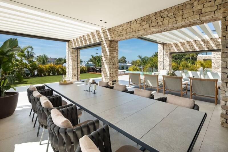 BlueLife Realty presents for sale this architectural masterpiece nestled in Nueva Andalucia, where every detail is designed to provide an unprecedented lifestyle. Just minutes from Puerto Banus and within walking distance of all amenities, this extraordinary property combines stunning modern design with an unbeatable location. The exterior of the villa features a stunning infinity pool, extending harmoniously from the garden to the interior, enhanced by LED lights which create an enchanting atmosphere at night. A generous terrace offers several lounging areas and outdoor dining areas, perfect for entertaining or relaxing in style. Accessed via a private driveway, the villa includes a convenient private garage, ensuring ultimate privacy and security. Enter into a simply spectacular interior. The open-plan living, dining and kitchen are filled with natural light, thanks to floor-to-ceiling windows and a double-height ceiling which exudes an airy and spacious feel. The living room features stunning Travertino Tajal stone walls, mimicking the exterior of the villa, and a cozy nook adorned with pretty trees. The kitchen is a dream, with generous proportions, state-of-the-art appliances, natural oak accents, plenty of storage and direct access to the formal and intimate dining rooms. An elevator connects all levels for added convenience, and also leads to the roof terrace offering 360º views of La Concha and the Mediterranean Sea. Villa P offers five superbly decorated en-suite bedrooms, each designed for maximum style and comfort. The master bedroom is a real must-see, with direct access to the terrace, a dedicated beauty area and a sumptuous master bathroom. Additionally, the villa includes an incredible level of entertainment, equipped with a custom bar, a wine bodega, a relaxation lounge and a TV section that doubles as a home cinema. Remarkably, you can see the stunning swimming pool from this level, adding a unique visual appeal. Situated in a prime location in Nueva Andalucia, Villa P offers close proximity to the famous Hard Rock Hotel, Centro Plaza shopping center and lively Puerto Banus. With easy access to the A-7 coastal road, the property effortlessly connects you to the surrounding areas, making it an enviable address for those seeking luxury and convenience in Marbella.
