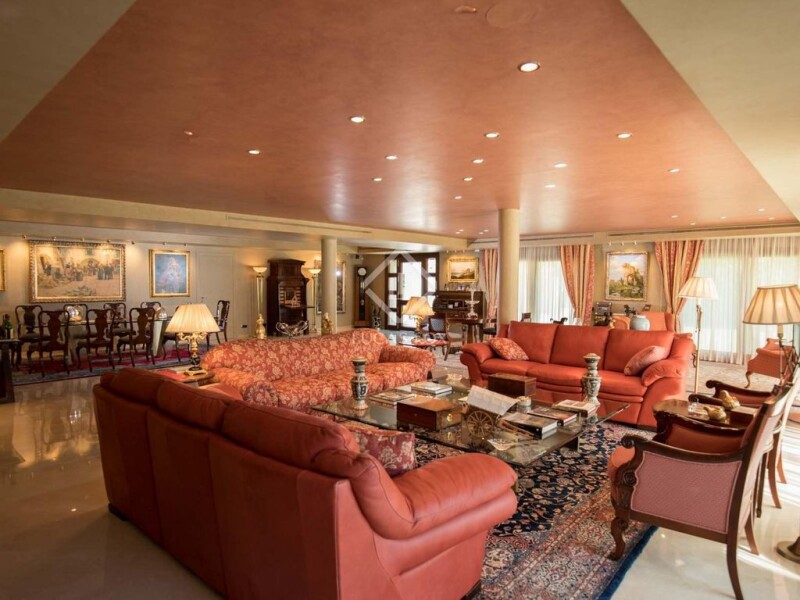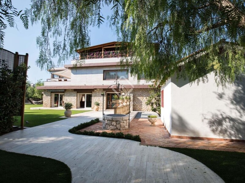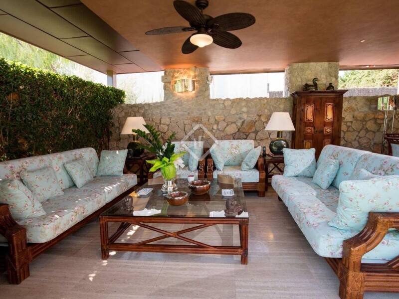 This large and luxurious villa is one street from the beach in the exclusive Terramar area of Sitges. This is the perfect location from which to combine the peace and quiet of a tree-lined residential neighbourhood with easy access to the famous golden sands, sweeping promenade and buzzing town centre. The house was renovated in 2018 and is arranged across 3 very generous floors. It is set in extensive mature gardens that are packed with character, with well established palms and manicured lawns, terraces and a variety of spaces to enjoy, including a superb barbecue area. Privacy is assured as the house occupies almost the entire block, with access on three sides. The large heated pool with a motorized cover has a fantastic chill out area with a luxurious gazebo, and is overlooked by the covered porch attached to the house with plenty of room for dining and relaxing. There are also terraces on each level, including a rooftop solarium, from which to make the most of the perfect climate and enjoy al fresco dining in complete comfort. The ground floor has a spectacular open living and dining area with floor-to-ceiling windows that flood the house with natural light and present beautiful garden views and lead to the gorgeous covered porch. An adjoining reception space is currently used as a snooker room, and this level also has a luxury kitchen and breakfast area, as well as 3 bedroom suites and another living room. Upstairs, the majestic main suite has a dressing room, hydro-massage shower, jacuzzi and access to its own terrace and gym. There are 3 more bedroom suites on this floor. The central focus of the top level is a fantastic, covered terrace with extensive space to entertain and a spiral staircase to a rooftop solatium. The upper level also has a very generous multipurpose space that is currently used as an office but is perfect for a wide variety of uses, from a home cinema or studio to a games room or extra bedroom. Everything about this house is spacious, luxurious and finished to a very high standard. Additional features include a lift, hot and cold air conditioning, a garage and paved drive, access via secure gates, plus service quarters for staff or extra guests.