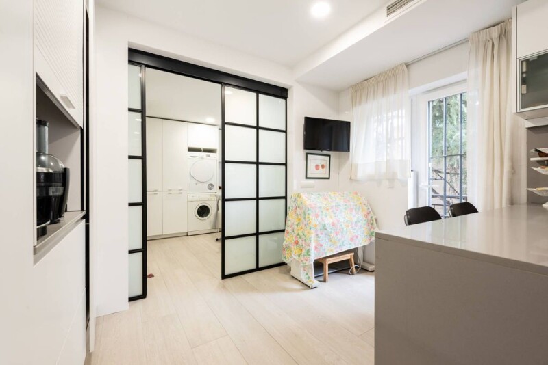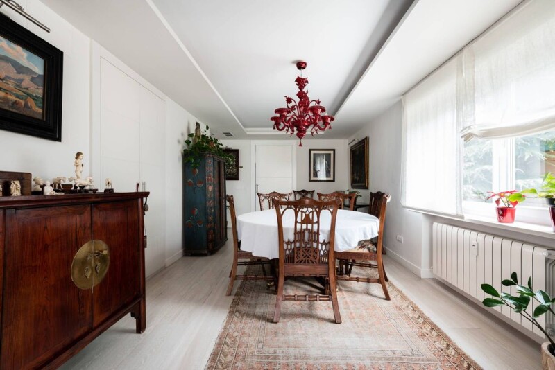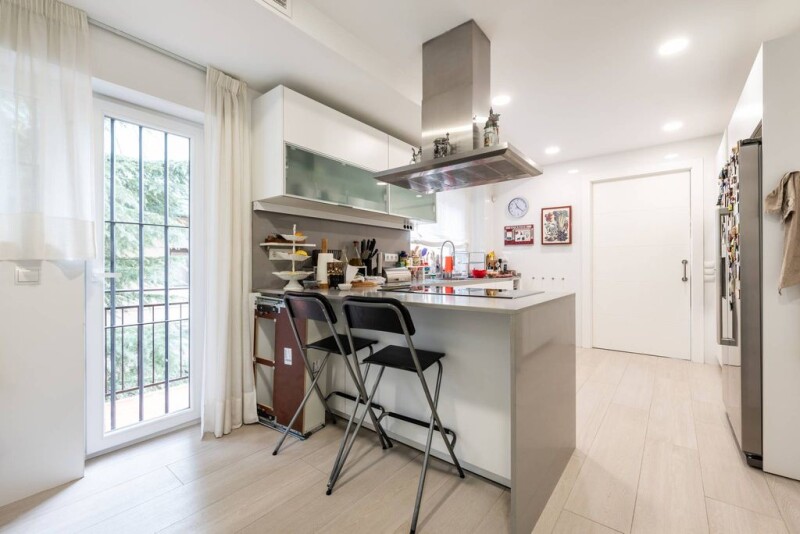 This spectacular duplex penthouse, located in one of the most exclusive areas of the capital, El Viso, has 252 square meters. Recently renovated, it has two large terraces and 2/3 covered and closed parking spaces, with independent deed. On the first floor, we find a spacious hall with a guest toilet and access to a generous terrace. Between the kitchen and the hall is the dining room. The kitchen, with office, is fully equipped with high quality materials and offers large storage capacity and pantry. It also has an adjoining room with service bathroom. On the upper floor, facing southeast, is the master bedroom, which includes a sitting area, large closets and a bathroom with natural light. The heating is central and all rooms have air conditioning. The property also includes a large storage room.