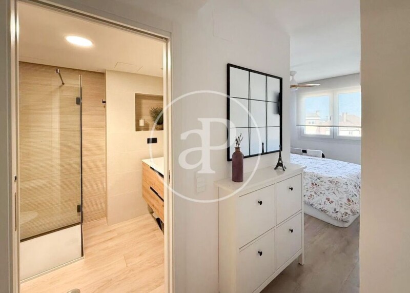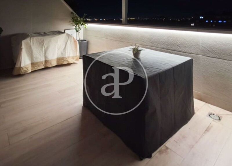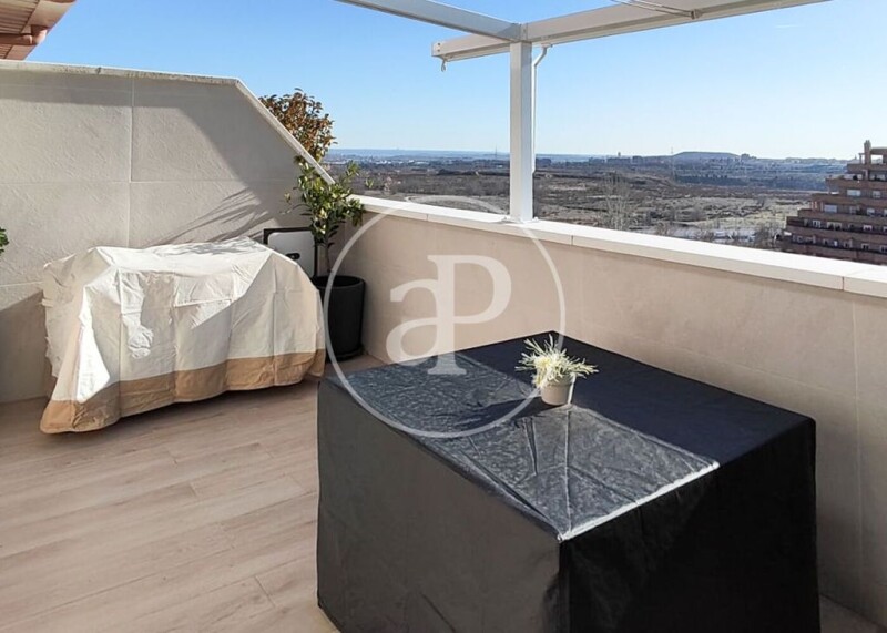 Aproperties presents penthouse with unobstructed views and luxury refurbishment in Las Rosas neighbourhood, 150 metres from metro station Line 2 (red). 15 minutes by metro from Goya street. It has 2 bedrooms, 2 bathrooms, terrace, garage and storage room. The terrace of 15 m² has water connection, automatic watering system, television connection, pergola and front awning. Smith brand kitchen with integrated dishwasher, full extraction drawers and large depth. Living room with extra wide sliding door of 92 cm. Equipped with perimeter ceiling lighting in all shades of white. Built-in home cinema speakers in the ceiling. Led throughout the living room. All electrical sockets and mechanisms are Simon 100 series with dimmer and domotic control of lights and blinds in the living room. The main bedroom has 5 linear metres of wardrobe and the secondary bedroom 1.5 metres. All windows with mosquito nets and motorised blinds and shutters. All blinds centralised on a push button. In both bathrooms: 72 cm sliding doors. Built-in shower taps by Tres, with ceiling-mounted shower heads and Bluetooth audio. Furniture with Chic&Bath brand drawers, with total extraction, cushioned and metal runners. The en-suite bathroom has two sinks. Energy efficiency A. Veka 82 carpentry, the highest range with triple gasket, triple glazing throughout the house, windows to the south with solar protection and in the north area with treatment to prevent the loss of heat or cold. RC2 protection with lugs all around the perimeter of the windows. The entire roof and walls of the house insulated with eight-centimetre rock wool. The house has Haier ducted air conditioning with heat and cold pump throughout the house. And four solar panels, with expenditure of 0 € of electricity between April and November. The heating is with Vaillant boiler with underfloor heating with two zones, one at night and the other one during the day. Pre-installation for aerothermal. Nearby sports centre with 46.041 m² (46.041 m²). Summer swimming pool for adults and children. 4 multi-sports courts (3 with tennis), 4 paddle tennis courts and 3 table tennis courts. In the indoor area there are 3 multi-sports pavilions, adult and children's swimming pool, multi-purpose room, martial arts room and weights room. Modern neighbourhood with all services. Several bus stops nearby: 140, 153, E2. Direct line to Retiro in 30 minutes. The property has natural north-south cross ventilation. Class 4 eurosegur entrance door with double cylinder and panic lock. Wired alarm points in living room, entrance and terrace. Wardrobes by Benno, completely lined on the inside with 19 mm textile linen wood with every detail (drawer unit, removable shoe racks, shelves, bars, boots, cleaning cupboard with hoover socket...). Sliding doors in the bedrooms and folding doors in the corridor. Home telephone with domotic control so that it can be answered and opened from the mobile phone or from the screen of the house. Can you imagine living here?.