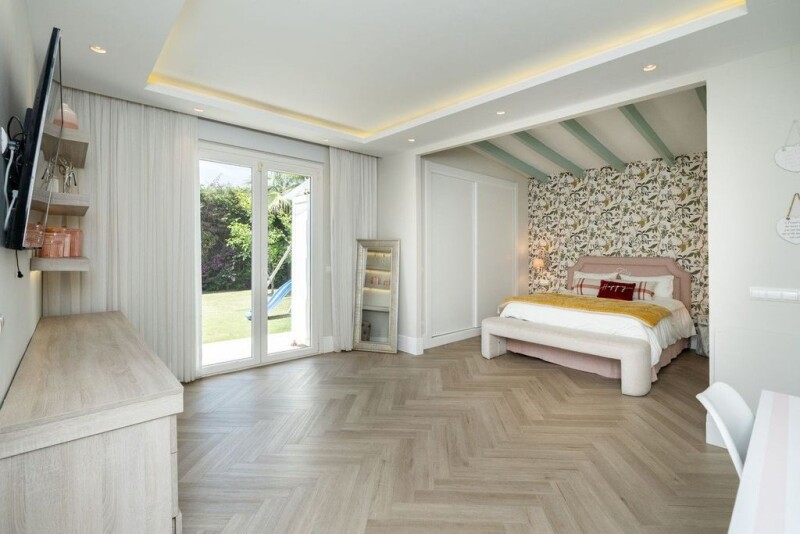 Luxury Villa in Bel Air on the New Golden Mile This exclusive villa, within walking distance to the Los Flamingos Golf Course, has been meticulously redesigned and renovated to the highest standards, creating a contemporary masterpiece. Ground Floor: - Living Room: Bright and spacious with a fireplace, opening to a porch with seating areas that lead to the swimming pool and garden. - Dining Room: Formal setting perfect for entertaining. - Kitchen: Fully fitted and equipped with a central island. - Bedrooms: Master suite with a walk-in wardrobe and two additional en-suite bedrooms. - Guest Toilet: Conveniently located for visitors. Upstairs: - Guest Bedroom: Includes a private bathroom and access to a secluded terrace. Features: - Outdoor Dining: Covered area with a built-in BBQ for alfresco dining. - Garden Amenities: Includes a gym and a children's playground. - Parking: Two spaces available—one in the garage and one under a carport. Location: A few minutes' drive from Estepona, Puerto Banús, and Marbella center, the villa is surrounded by numerous amenities including golf courses, sandy beaches, restaurants, and branded shops. It offers easy access to all points along the Costa del Sol, with the airport and high-speed trains less than 45 minutes away. This luxurious property perfectly blends contemporary design with unparalleled convenience in one of the most desirable areas on the Costa del Sol.